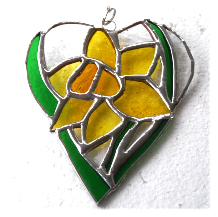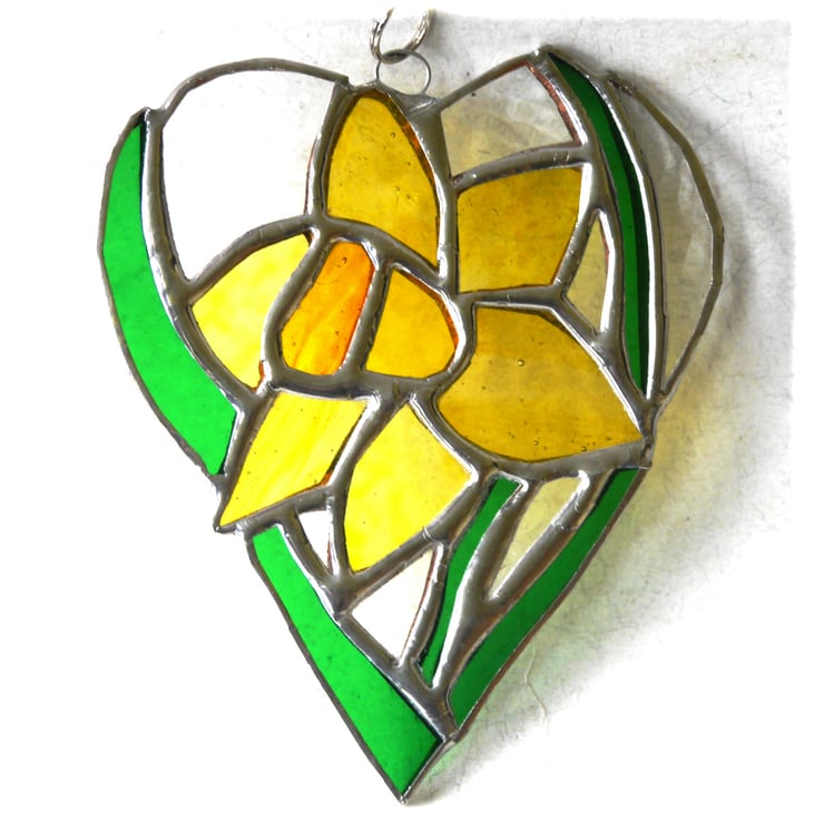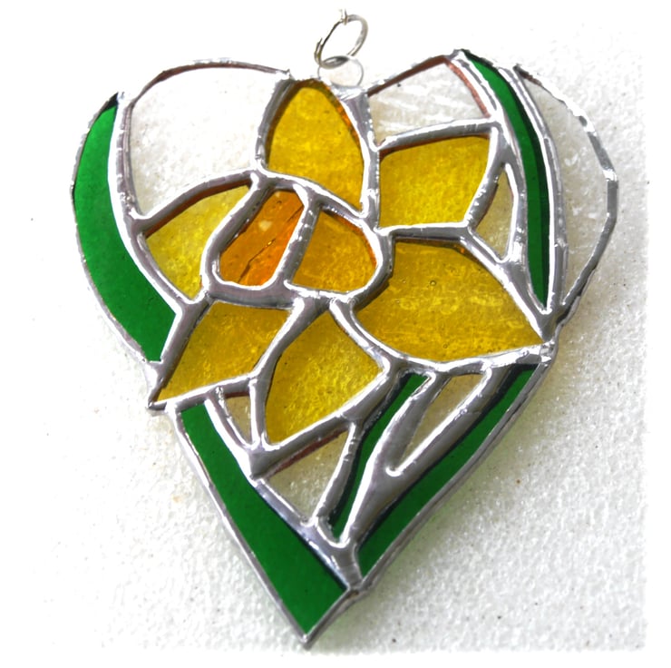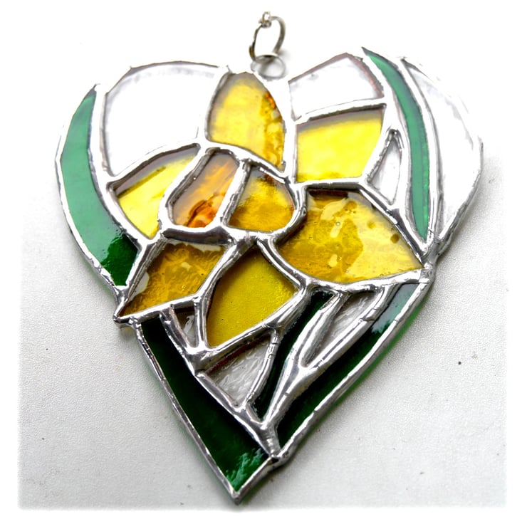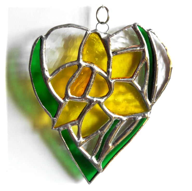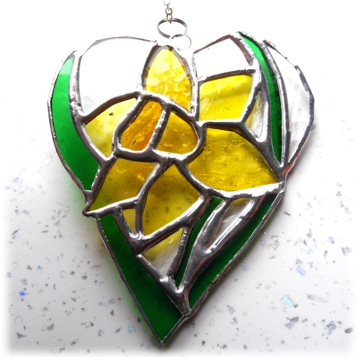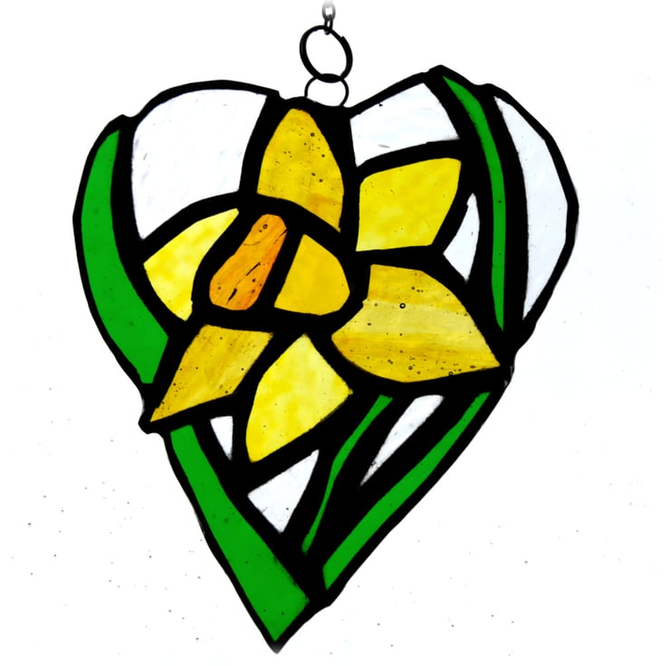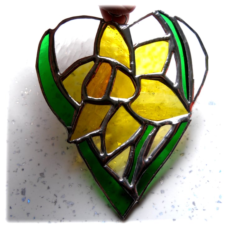 One of my flower heart range. A daffodil, bright yellow with strappy green leaves. The flower is enclosed in a heart shape with the surrounding glass in clear, gently textured glass.
