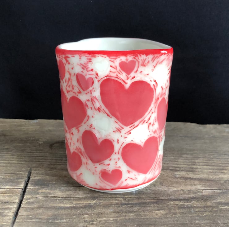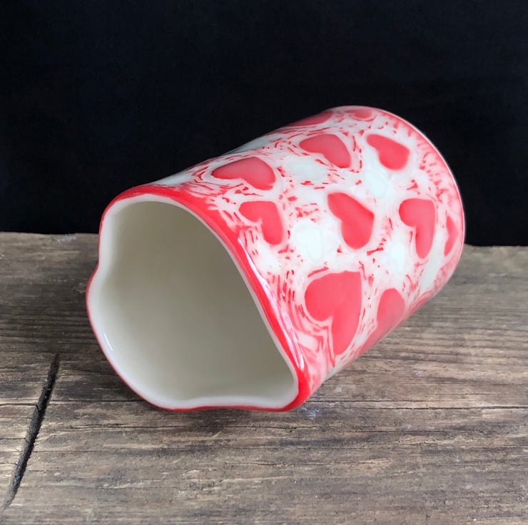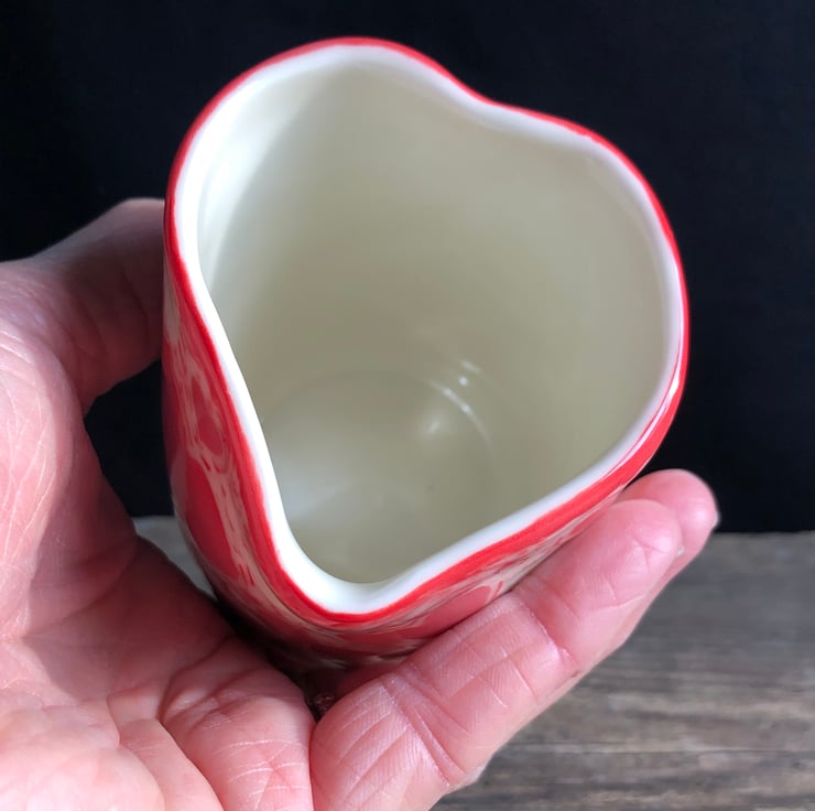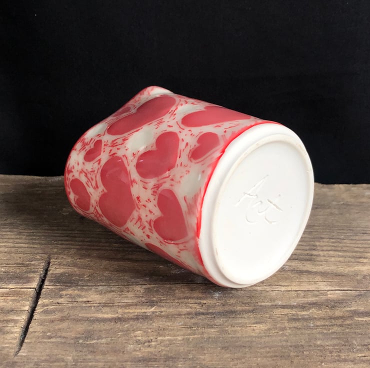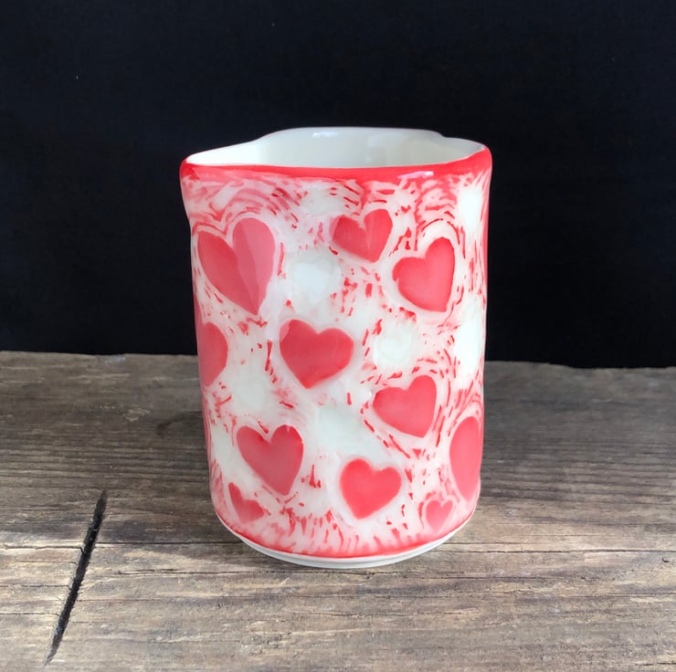 Cute porcelain heart-shaped handleless cream/milk jug with sgraffito heart design. Made from slip-cast porcelain, the heart shape formed by hand. Signed on the base before first firing.