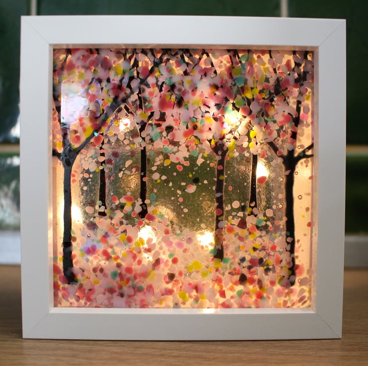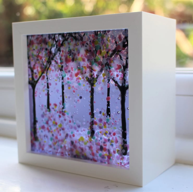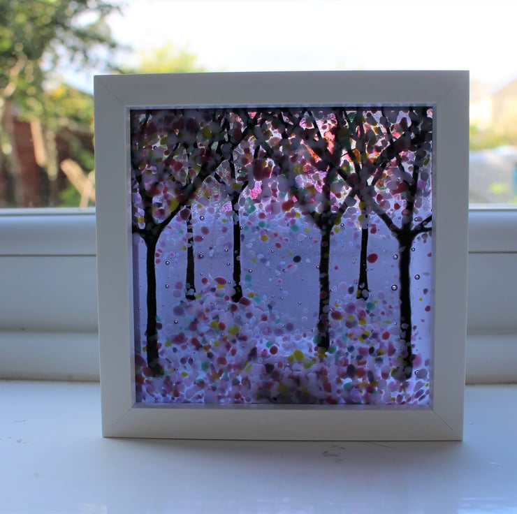 Created by hand drawing trees onto sheets of glass which are then fused with the addition of frit and satisfyingly sparkly flakes of dichroic glass. The resulting glass panels are then framed in a good quality freestanding white box frame.