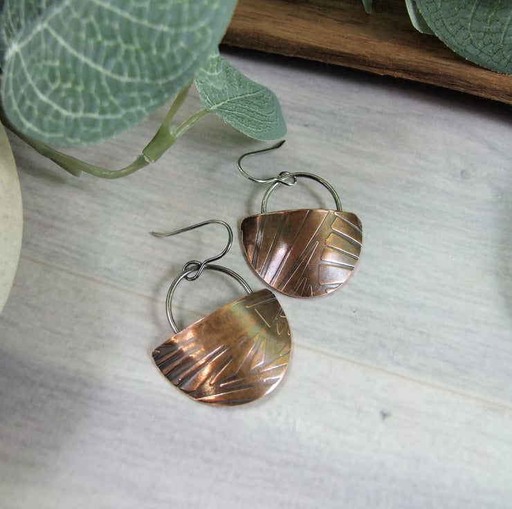 I have created the half circle shapes from copper sheet, hand cut and embossed with an abstract lines pattern. I then slightly domed the shapes and then soldered on shaped silver wire and added ear hooks. The earrings have been given an oxidised finish and polished.