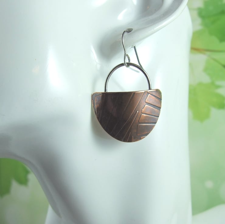 Sterling Silver and Patterned Copper Half Circle Earrings. Embossed abstract lines pattern droppers.