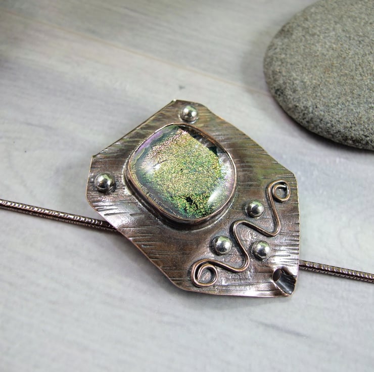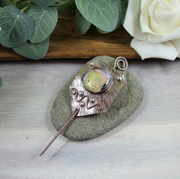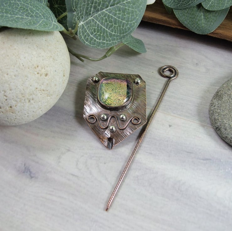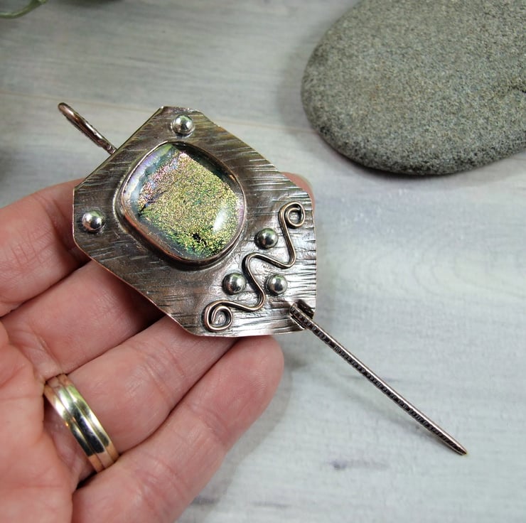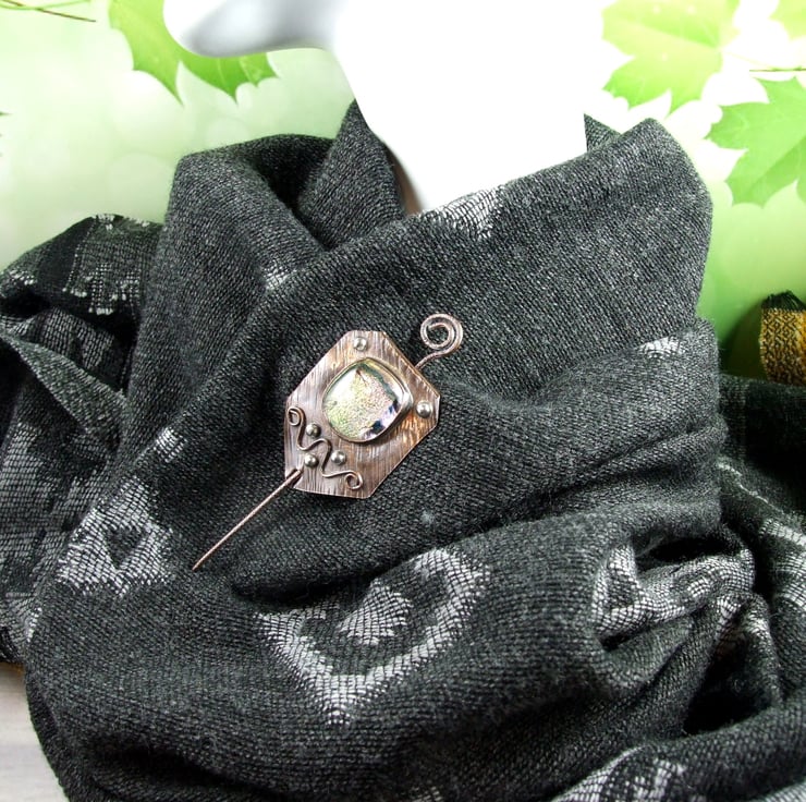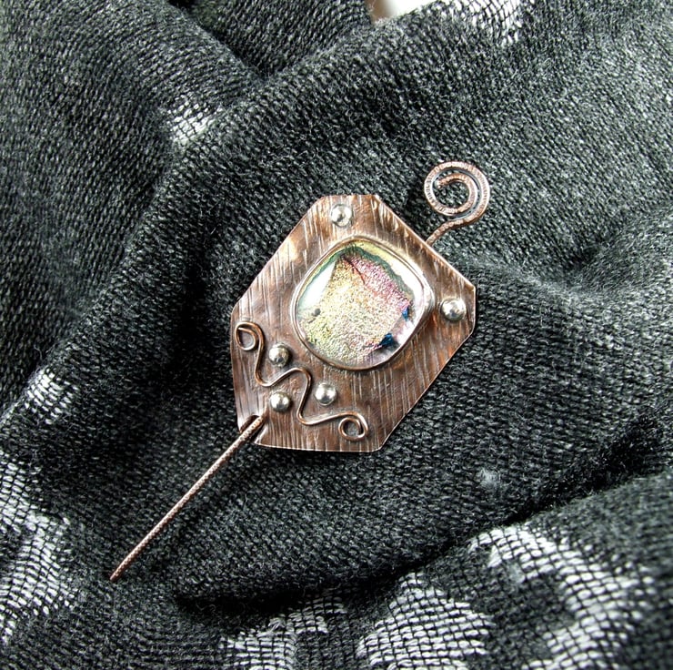 The shawl pin is a one off design in a freeform style with a copper base and pin. I created the base by cutting a rectangle shape from copper sheet then texturing bending and creating a channel for the pin to slide through. I made the dichroic glass cabachon from small fragments of patterned and coloured glass which has then been fused in my kiln. The cabachon is set in a copper bezel made to fit the glass perfectly and finished with white metal embellishment for contrast.