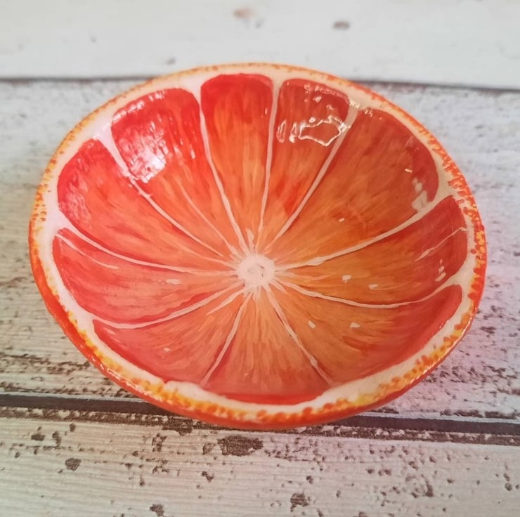 This is my little mini orange trinket dish. Completely handmade from Air dry clay and handpainted to look like a realistic orange half. Turn it over and it has the little pocked pits of an orange skin. These trinket dishes are very small at just under 7cm in diameter, but are perfect on dressing tables for rings and earrings.