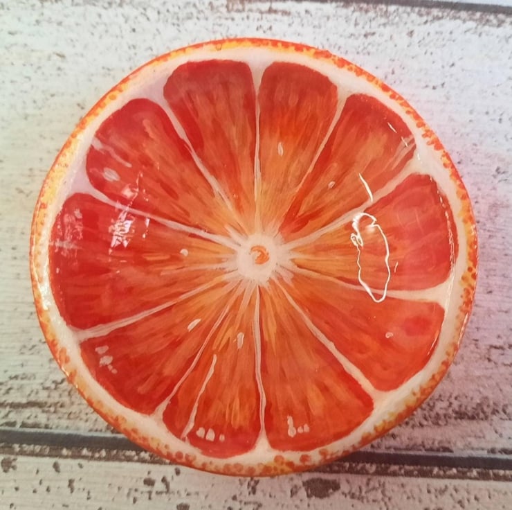I love to paint simple everyday items like fruit and vegetables as well as animals, but I wanted to make something that was 3D and more representational of the fruit but also functional. I made the shape of the orange an painted it as I would any painting.