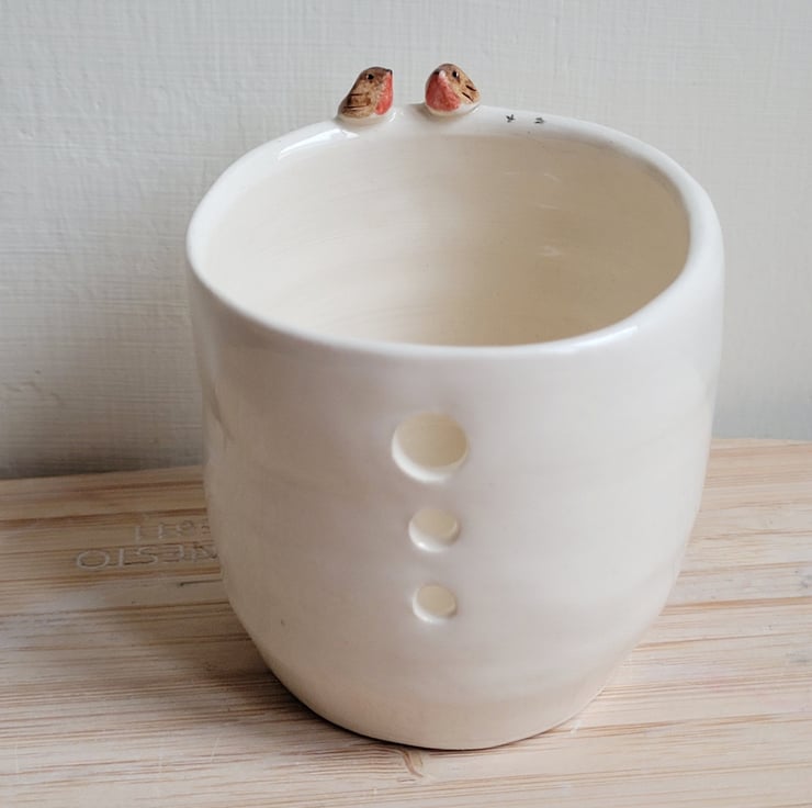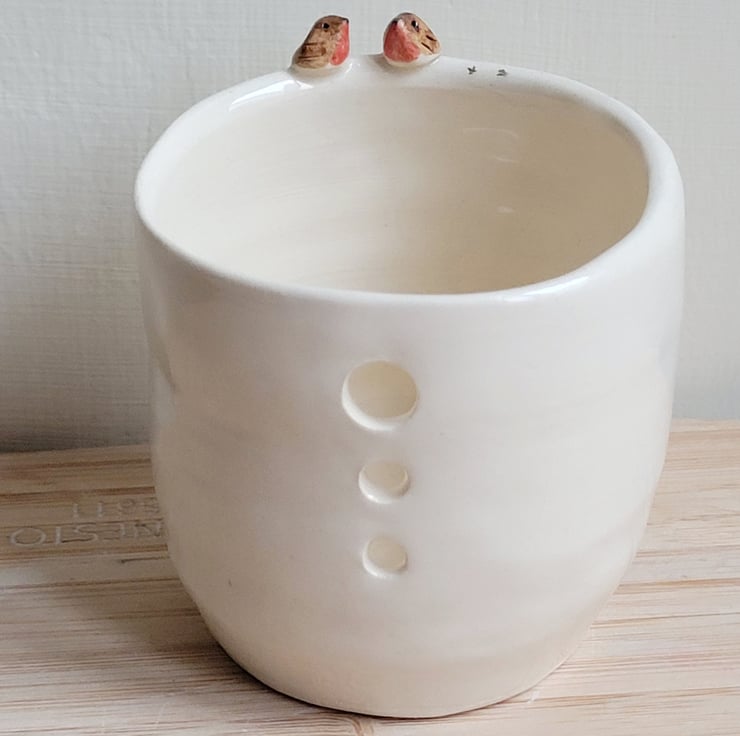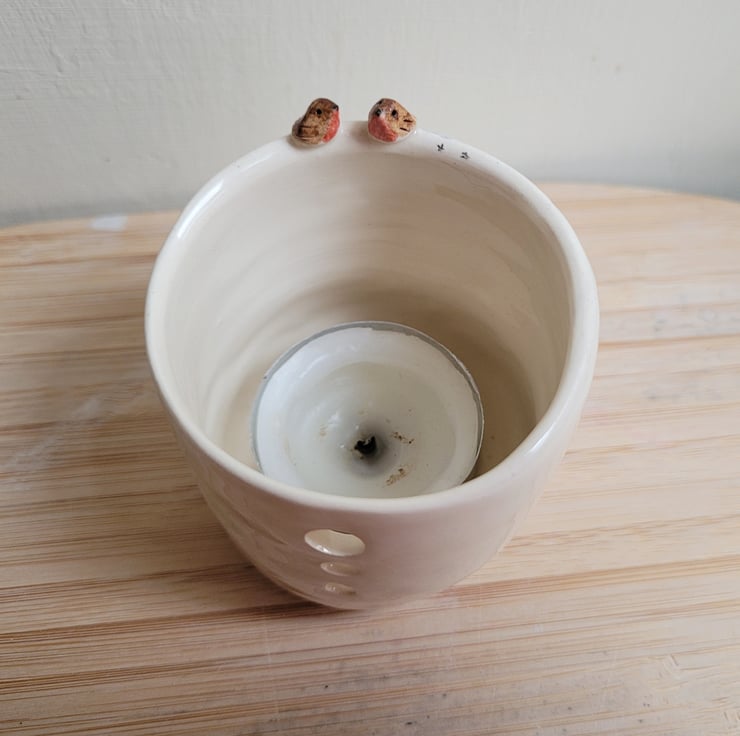 Pottery robin tea light candle holder with a round cut outs. There are 2 hand modelled birds perched on the side in white clay and clear shiny glaze .