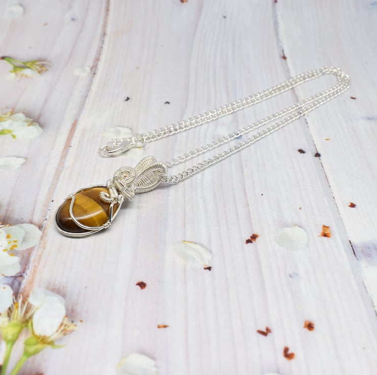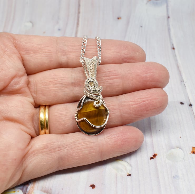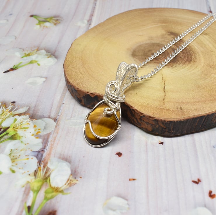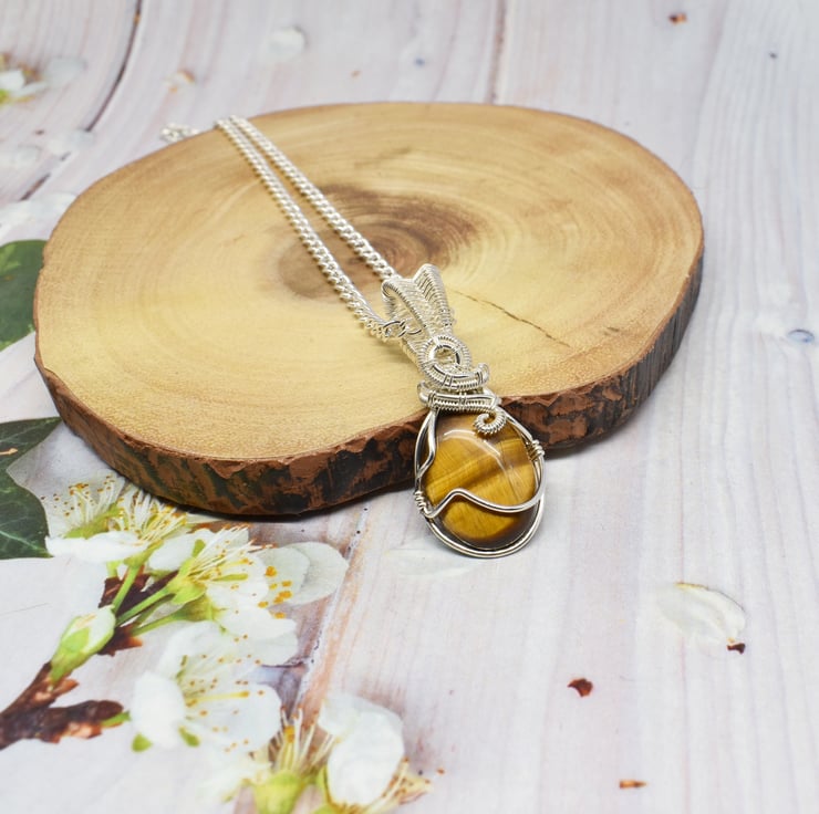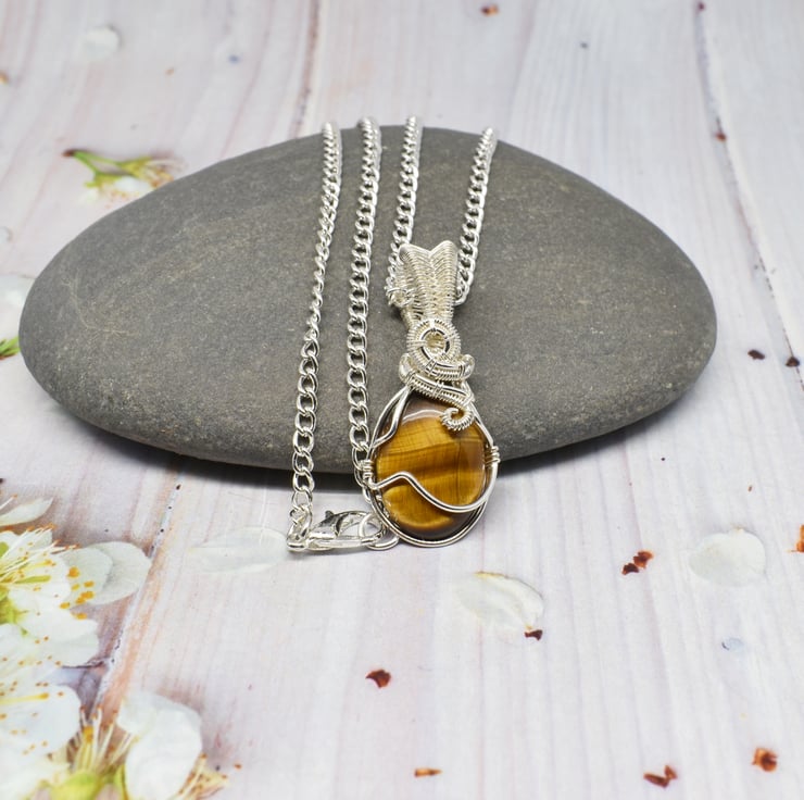 A striking tigers eye wire wrapped and woven in silver filled wire.