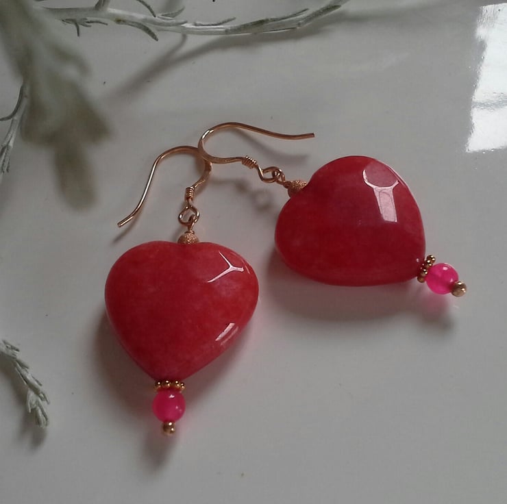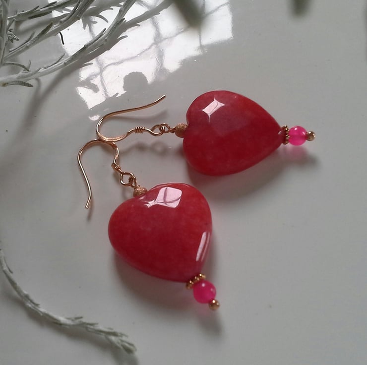 A lovely statement pair of earrings hand crafted using 15mm faceted heart cut quartzite gemstones complimented with 4mm pink quartzite rounds. These earrings will make a perfect gift for a loved one on valentines day.