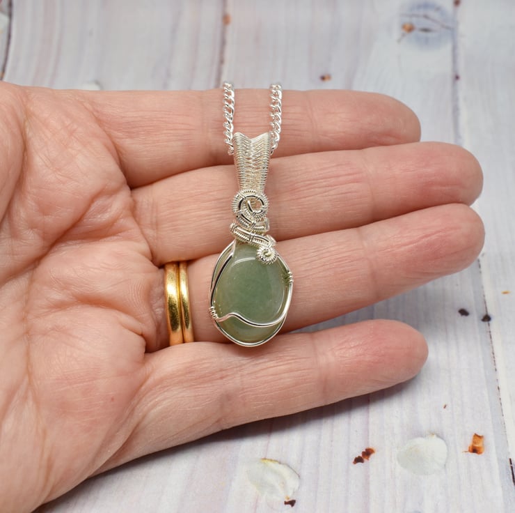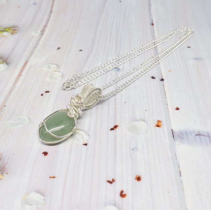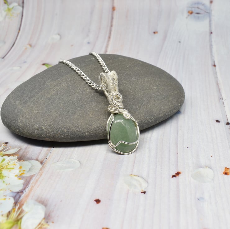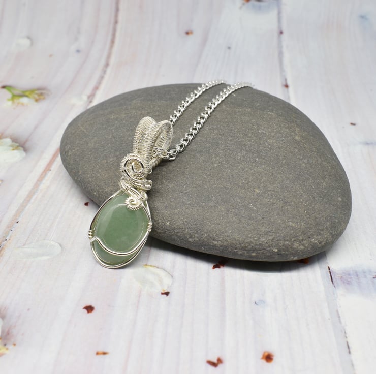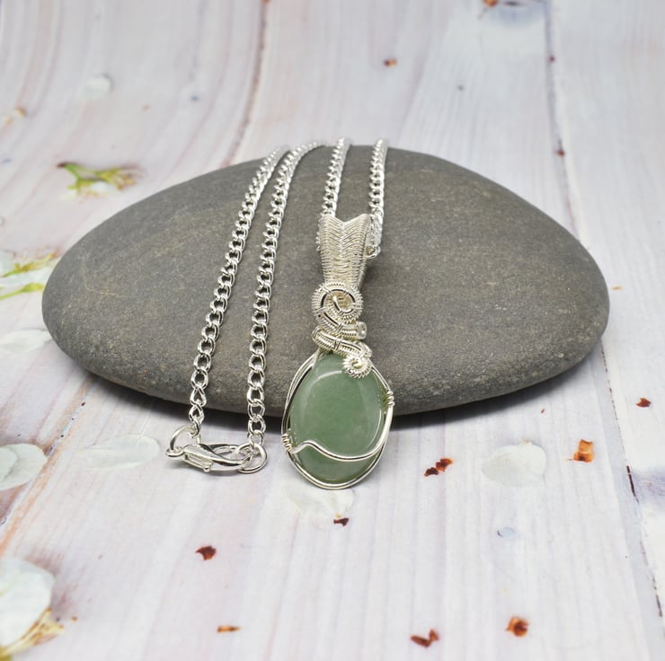 I used silver filled wire to wrap and weave around this green aventurine to make this pretty necklace.