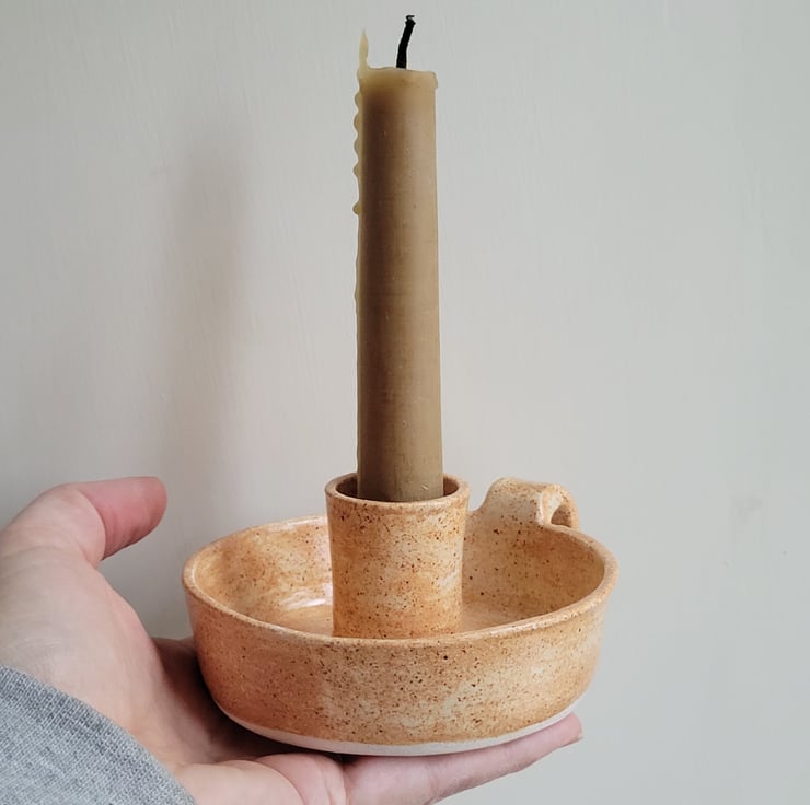 Speckled warm beige ceramic candle holder. Handthrown in white clay with rustic speckled toffee glaze .