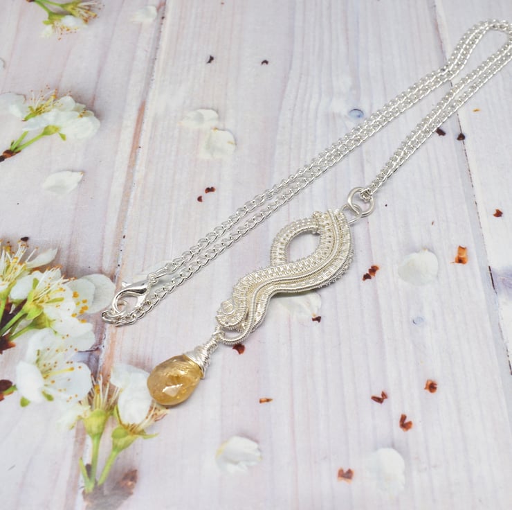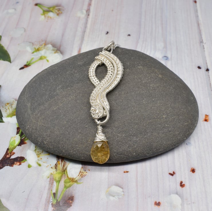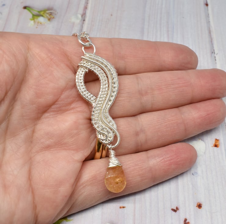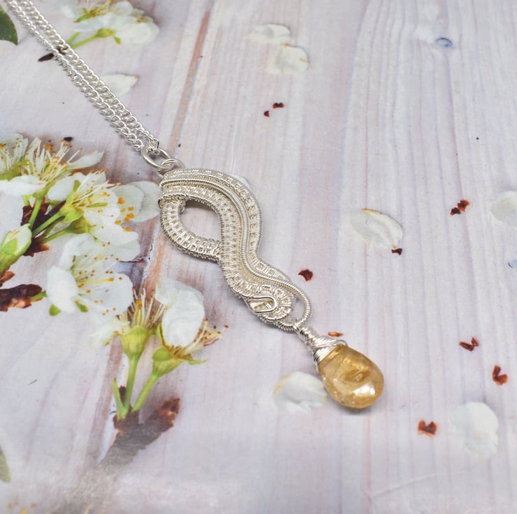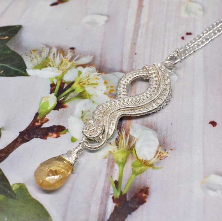 I have hand woven layers of silver filled wire to form the pendant then added a citrine dangle at the bottom.