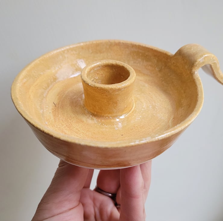 Hand-made candle holder. Once thrown on my potter's wheel, the tab handle was added, the piece was trimmed and bisque fired then was dipped in lead-free glaze prior to the final firing .