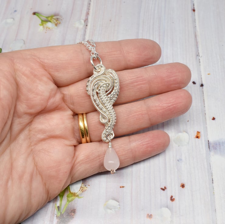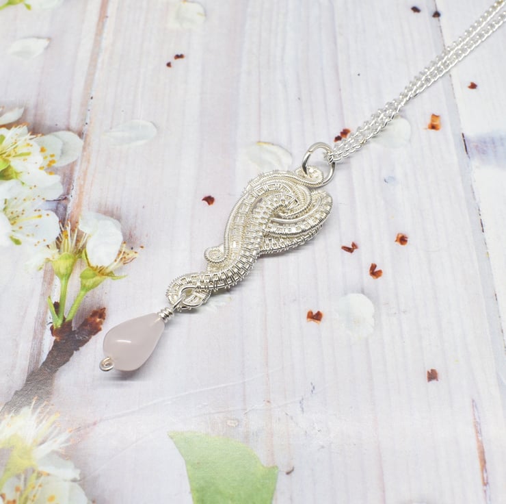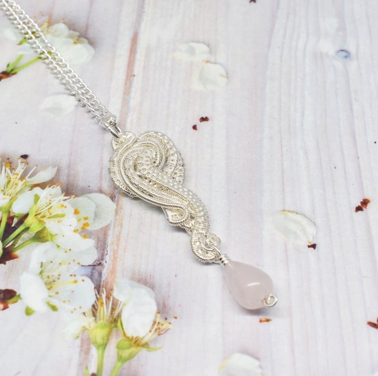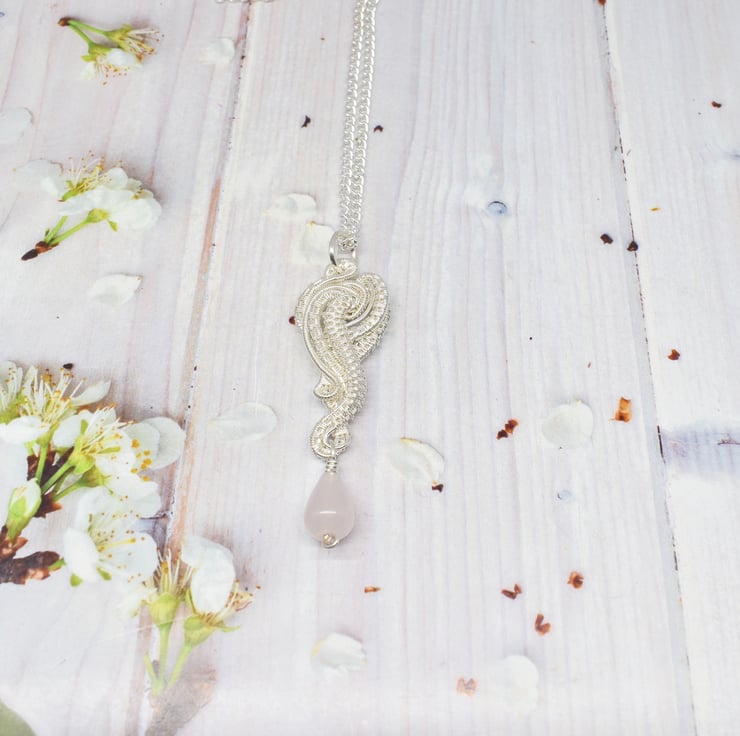 Layers of hand woven silver filled wire make up this striking pendant which has a pretty rose quartz dangle at the bottom.