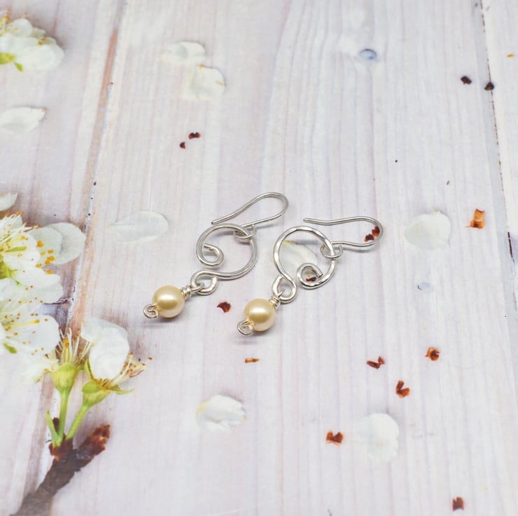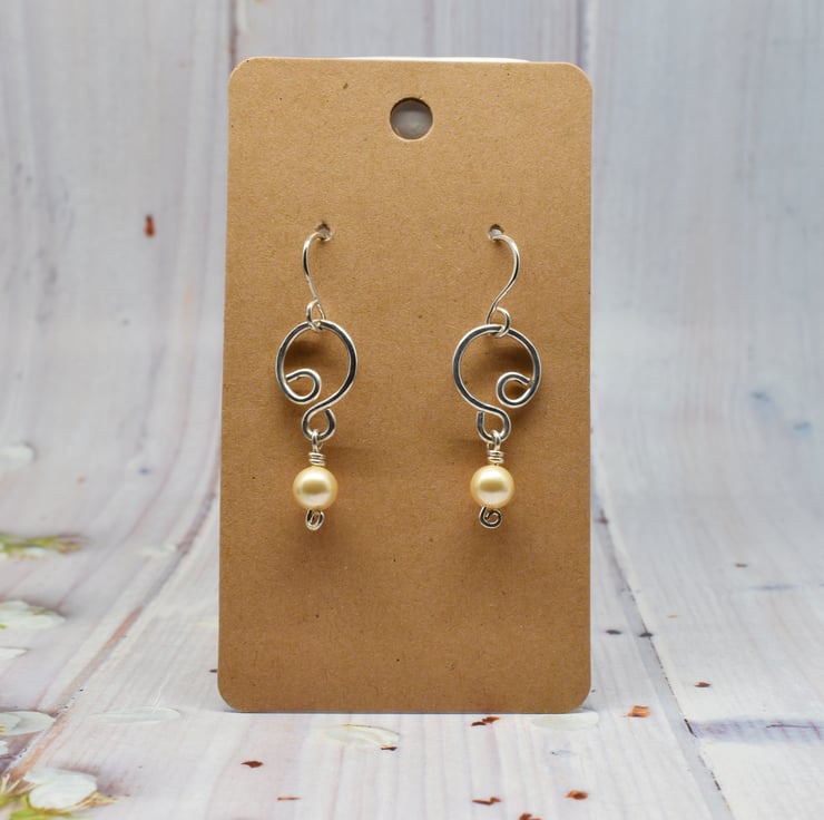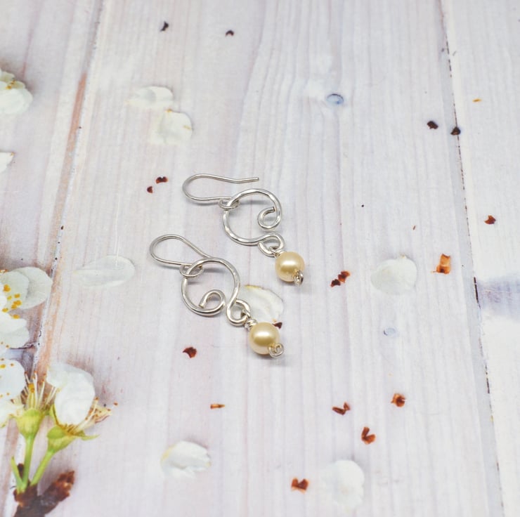 These dainty earrings are handmade using silver filled wire which is formed and hammered to shape with a 4 mm shell pearl dangle at the bottom. They hang from handmade silver filled ear wires.