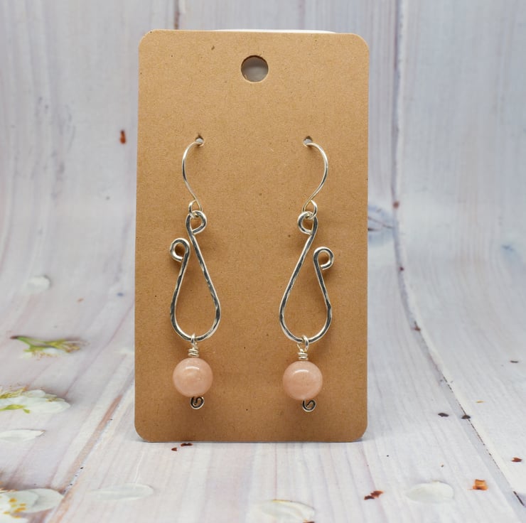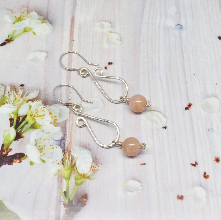 These drop earrings are completely handmade using silver filled wire which is formed and hammered for texture. An 8 mm sunstone dangle is added at the bottom and they hang from handmade silver filled ear wires.