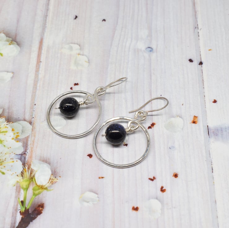 I used silver filled wire to form the hoops which have been hammered for texture. They have an 8 mm blue goldstone in the centre and hang from handmade silver filled ear wires.