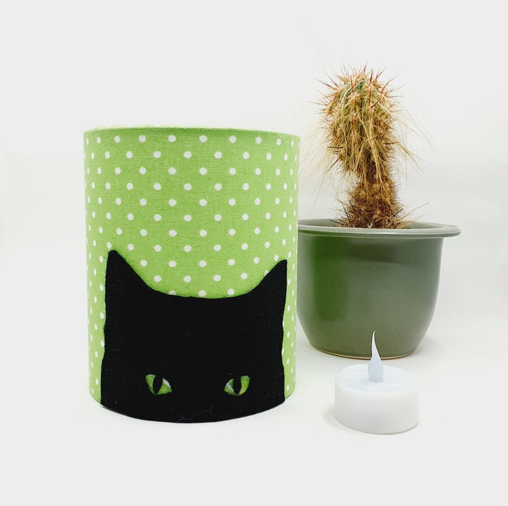 Perfect for any cat lover, this lantern features a hand-cut black felt cat peeking up at you with its blue-green eyes during the day. The fabric background is an apple-green colour with wite spots. With the cat placement on each lantern varying, every one is unique.