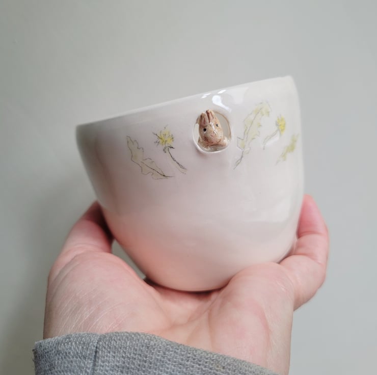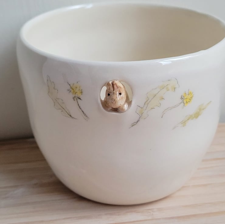 A hand made ceramic beaker or small planter made on my wheel. I added a tiny beige bunny peaking through a round cut out and footprints inside the handleless cup. I bisque fired the mug, hand painted it with underglaze colours and then it was clear glazed and fired to earthenware temperatures in my kiln.