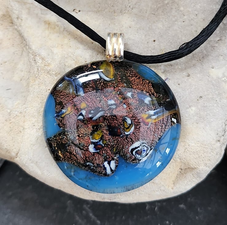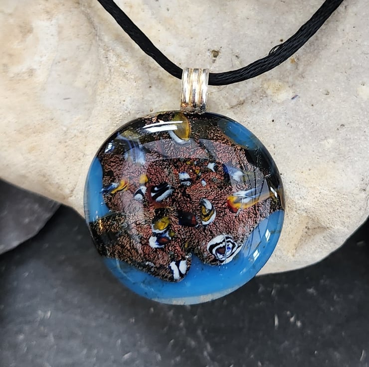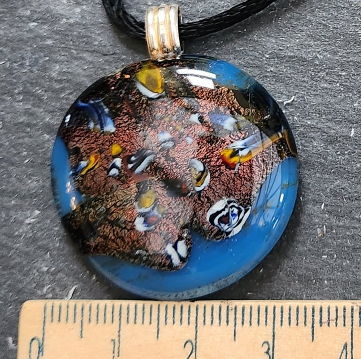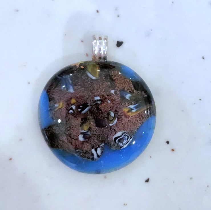 Almost round,blue glass, kiln fired with crushed mixed colour millefiori and dichroic glass. Just over 3cms across. Large sterling silver bail fitting.