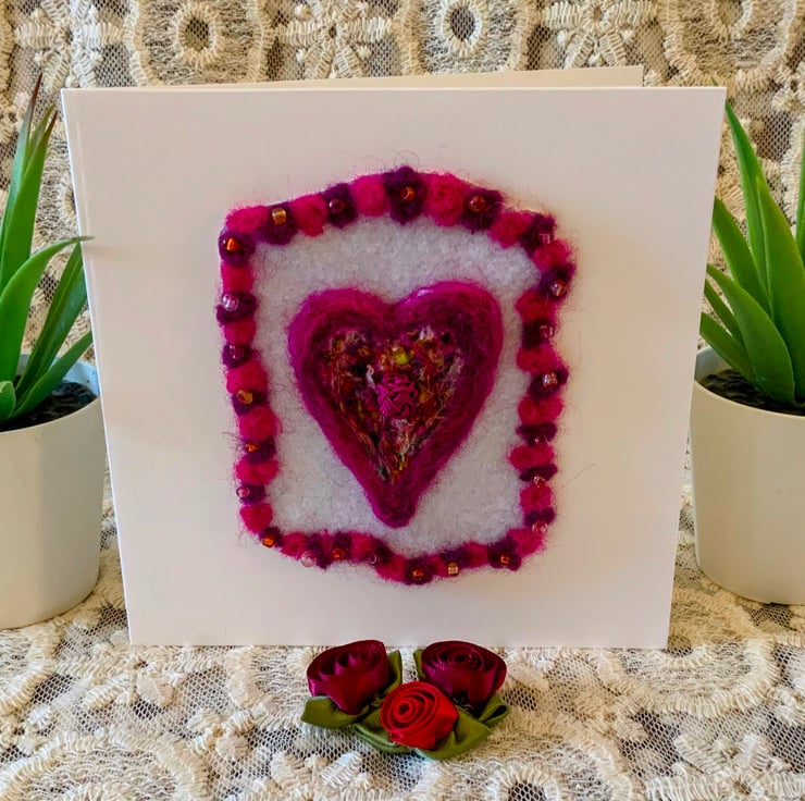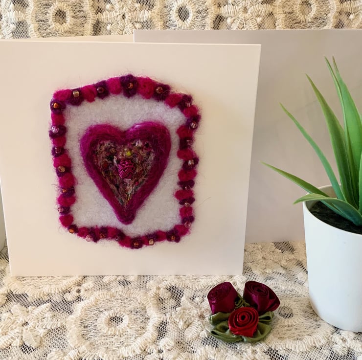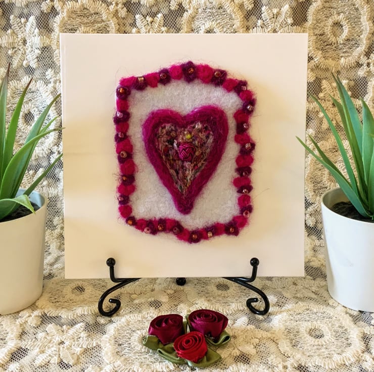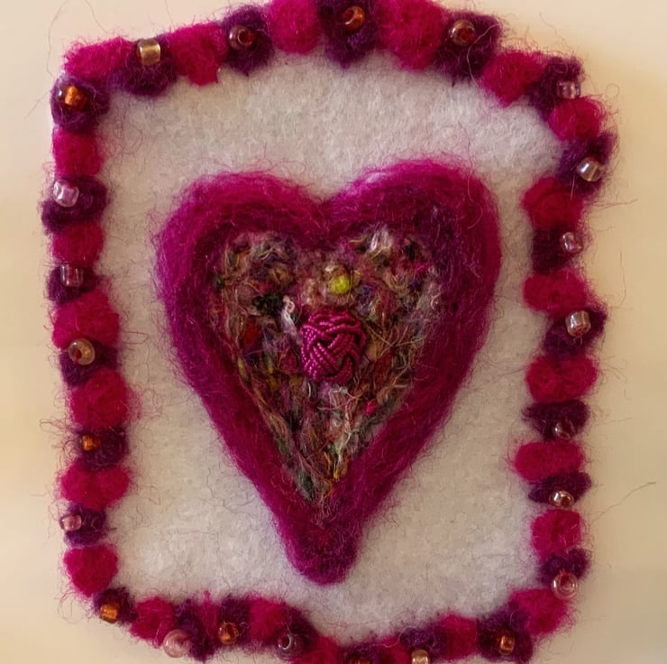 A square A5 Needle felted Merino wool heart featuring a silk twine rose button within the centre which has been felted with sari silk wool of complementary colours and framed in merino wool and mini glass beads on a white felt background.