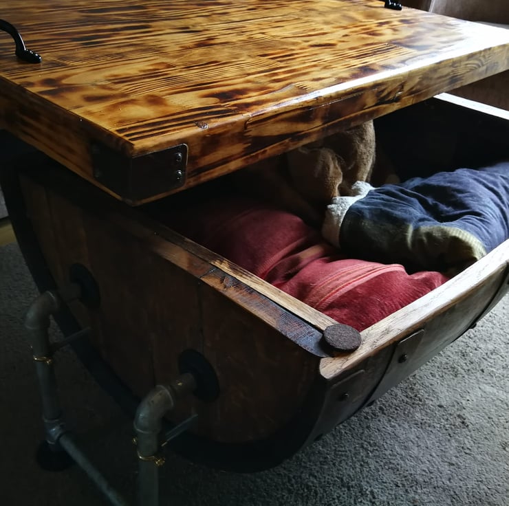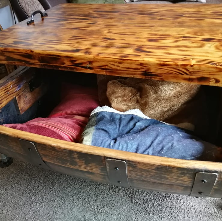 These coffee tables aren't only full of rust charm but are really functional too. The top pops up, so you can use the inside for storage. The top is made with reclaimed pine, and the legs are metal gas pipes.