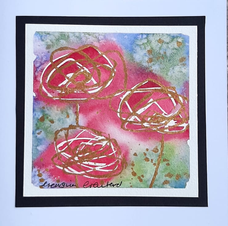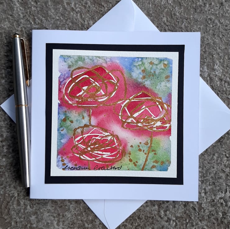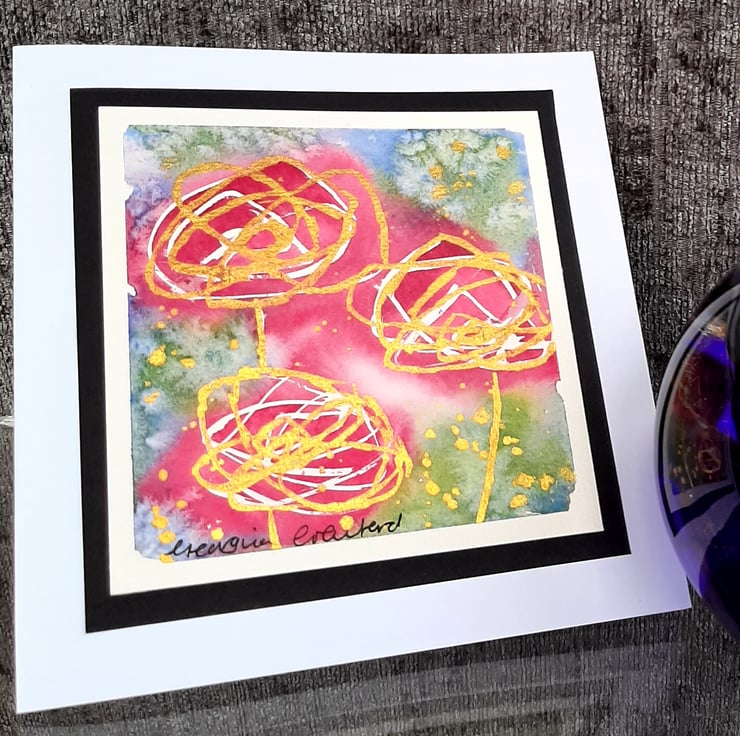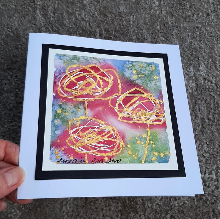 Beautiful abstract watercolour painting made into a card of roses with gold glitter paint.