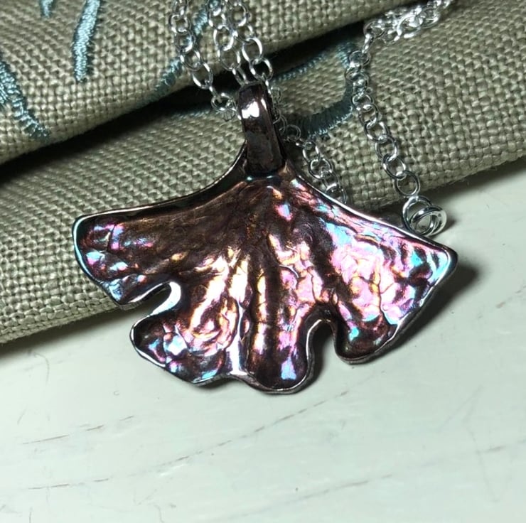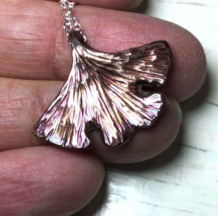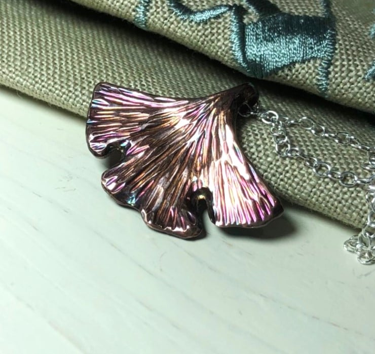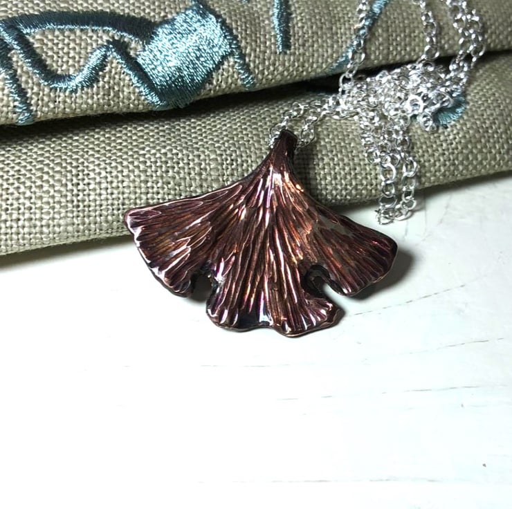 This lovely little ginko leaf pendant is made in copper with texturing to represent the markings of a ginko leaf.