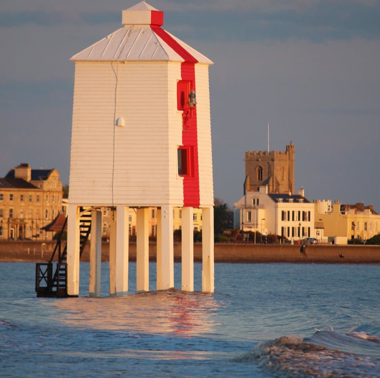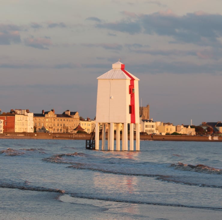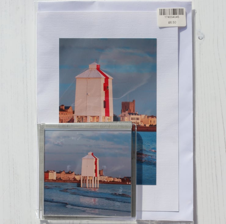 The iconic Burnham-on-Sea Low Lighthouse, showing the red warning stripe; and the town in the background, on an incoming tide. A 6" x 4" photo mounted on a card, with a coaster, 10cm. Sq. ; N.B. the 1st. photo has a circular light reflection on the chello envelope, which is not on the actual photo.