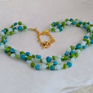 This bracelet features beautiful faceted genuine emeralds, the birthstone for May, in various shades of green. Using specialist beading thread, they have been stitched onto soft green leather cord. A brass button with a leopard print design has been used as a fastener.