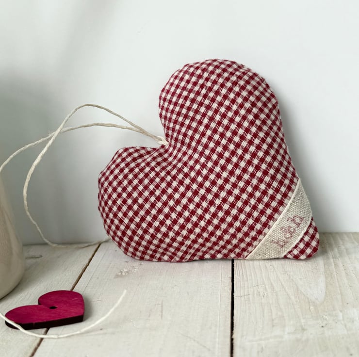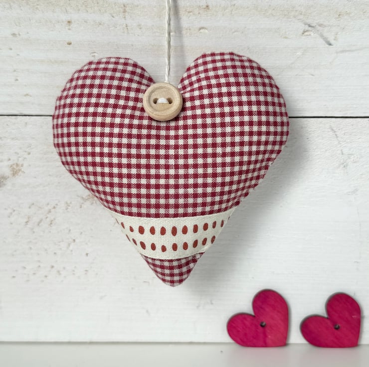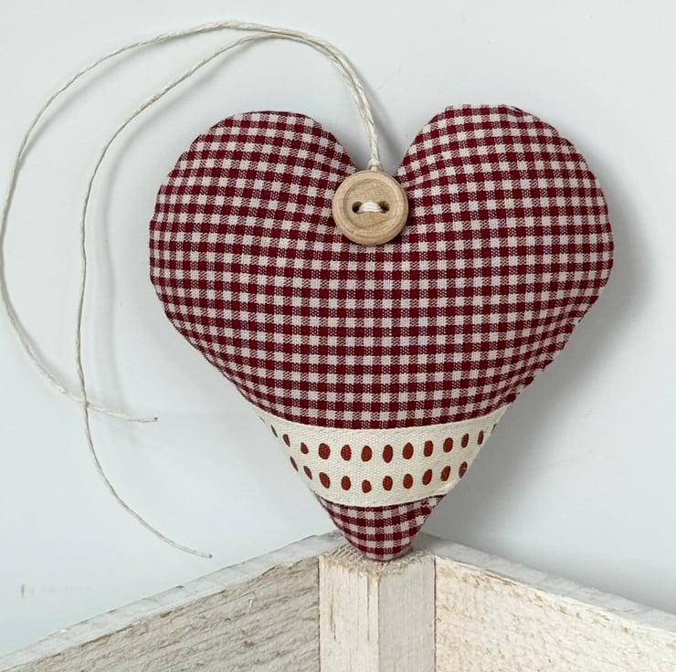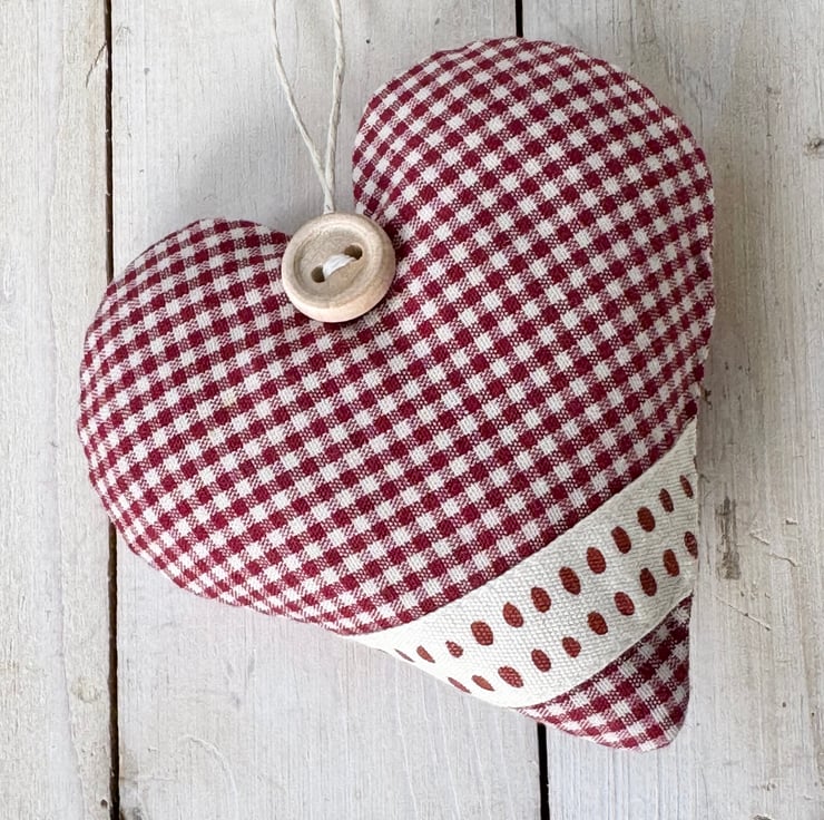 A handmade heart, padded with either fragrant Hampshire lavender, in country-style dark red mini-gingham cotton and finished with a stylish ribbon band of red dots on cream, plus a rustic wooden button and natural hemp twine hanging ties.
