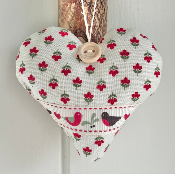 A handmade heart, padded with either fragrant Hampshire lavender, in a pretty floral design in red and green on cream cotton, and finished with a delightful ribbon band featuring love birds and hearts, plus a rustic wooden button and natural hemp twine hanging ties.