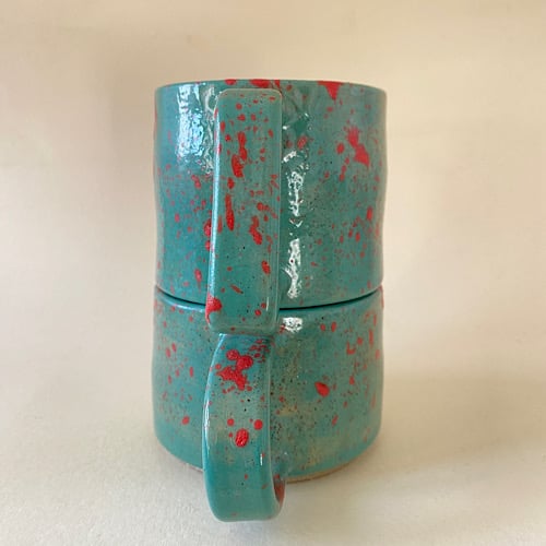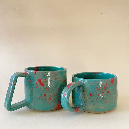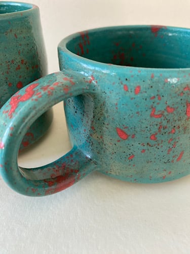 Both cups have a turquoise covering with pink splats.