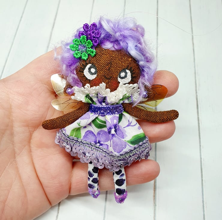 Hand sewn miniature art doll. This tiny doll measures roughly 10cm tall and has hand dyed wool locks as hair needlefelted into place. Her hair is adorned with glittered flowers and she has bead earings. Violet wears a dress with sequin trim and lace neck ruffle. Dress is sewn into place, as are the printed wings. Violet has sparkly glitter feet and a hand painted face. She comes with transparent loop hanger. This is delicate and for decorative purposes only and not a toy.