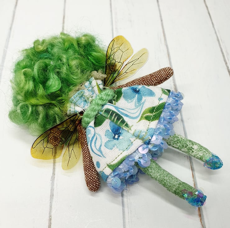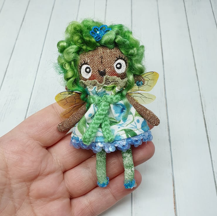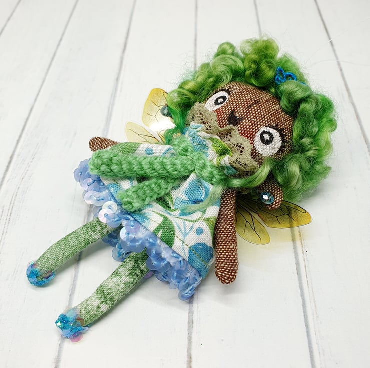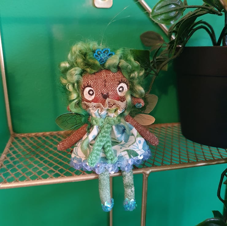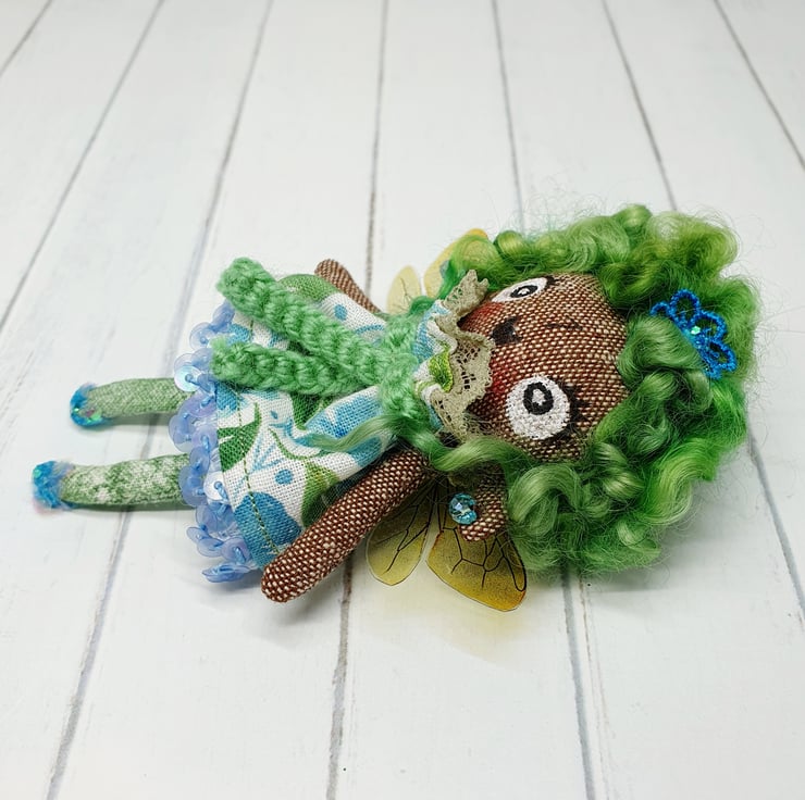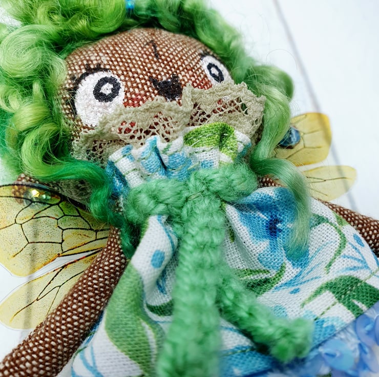 Hand sewn miniature art doll. This tiny doll measures roughly 10cm tall and has hand dyed wool locks as hair needlefelted into place. Her hair is adorned with glittered flowers and she has bead earings. Lapis wears a dress with sequin trim and lace neck ruffle. Lapis has a crocheted scarf. Dress is sewn into place, as are the printed wings. Lapis has sparkly glitter feet and a hand painted face. She comes with transparent loop hanger. This is delicate and for decorative purposes only and not a toy.