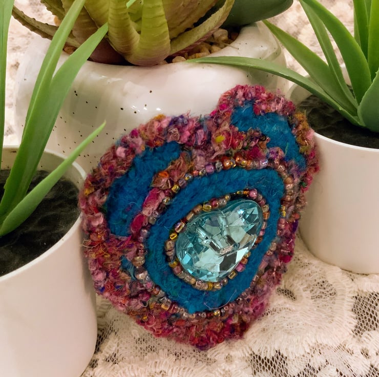 Wool is teal blue and many shades of pink giving the appearance of dried pot puri flowers. A vintage style with embroidered beads surrounding the heart button and outer area. The back has a simple secure click open and close silver metal brooch pin