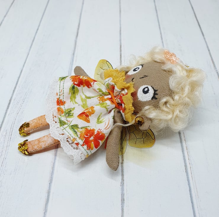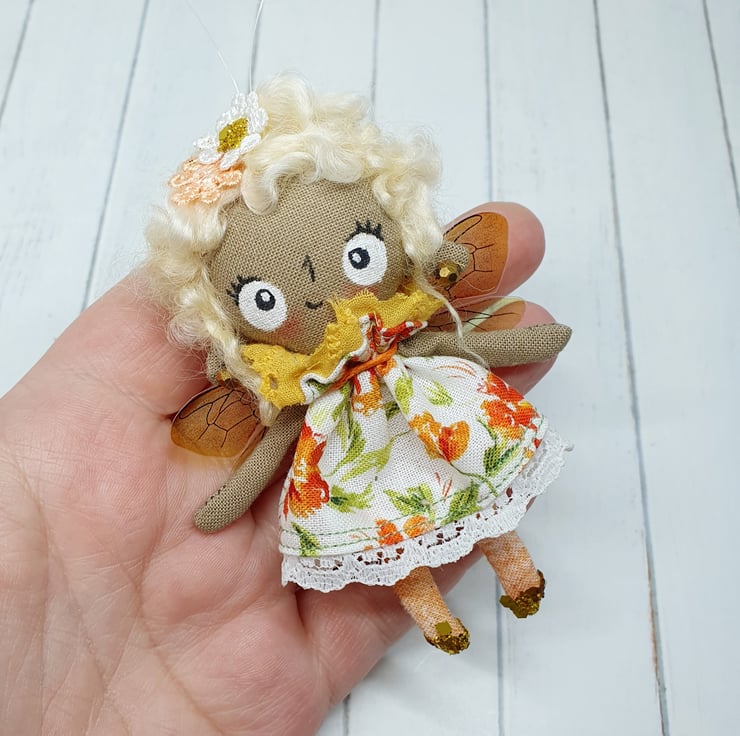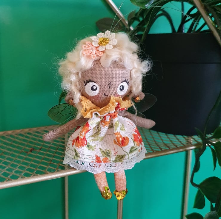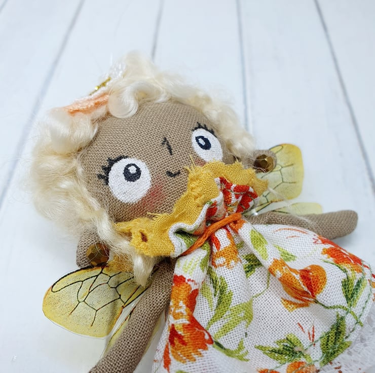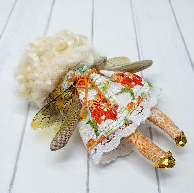 Hand sewn miniature art doll. This tiny doll measures roughly 10cm tall and has hand dyed wool locks as hair needlefelted into place. Her hair is adorned with glittered flowers and she has bead earings. Marigold wears a dress with lace trim and lace neck ruffle. Dress is sewn into place, as are the printed wings. Marigold has sparkly glitter feet and a hand painted face. She comes with transparent loop hanger. This is delicate and for decorative purposes only and not a toy.
