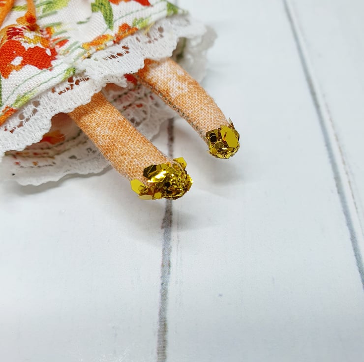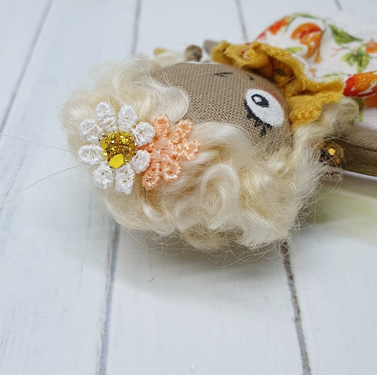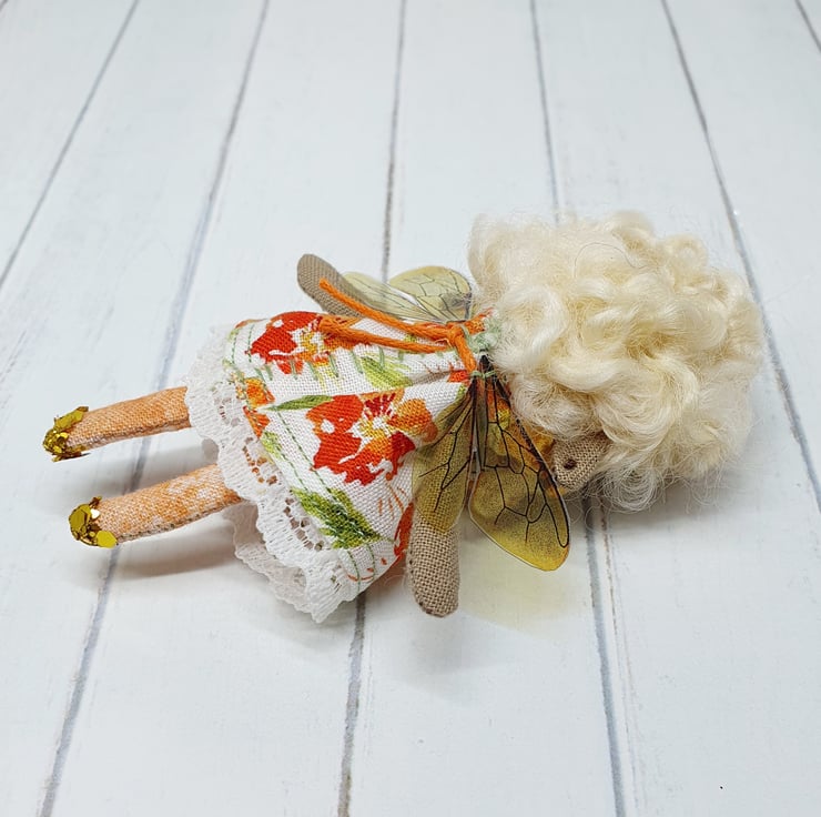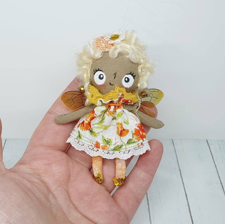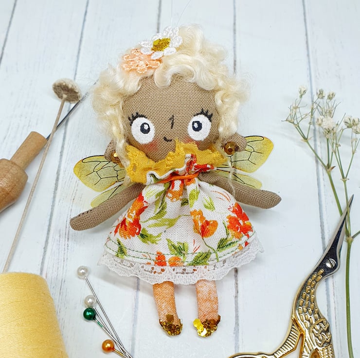 Hand sewn miniature art doll. This tiny doll measures roughly 10cm tall and has hand dyed wool locks as hair needlefelted into place. Her hair is adorned with glittered flowers and she has bead earings. Marigold wears a dress with lace trim and lace neck ruffle. Dress is sewn into place, as are the printed wings. Marigold has sparkly glitter feet and a hand painted face. She comes with transparent loop hanger. This is delicate and for decorative purposes only and not a toy.