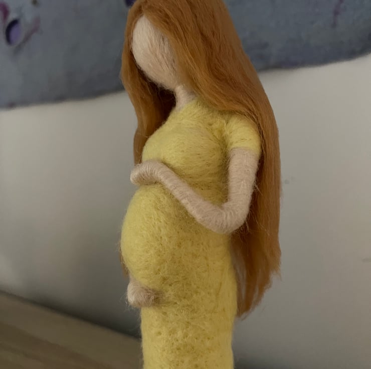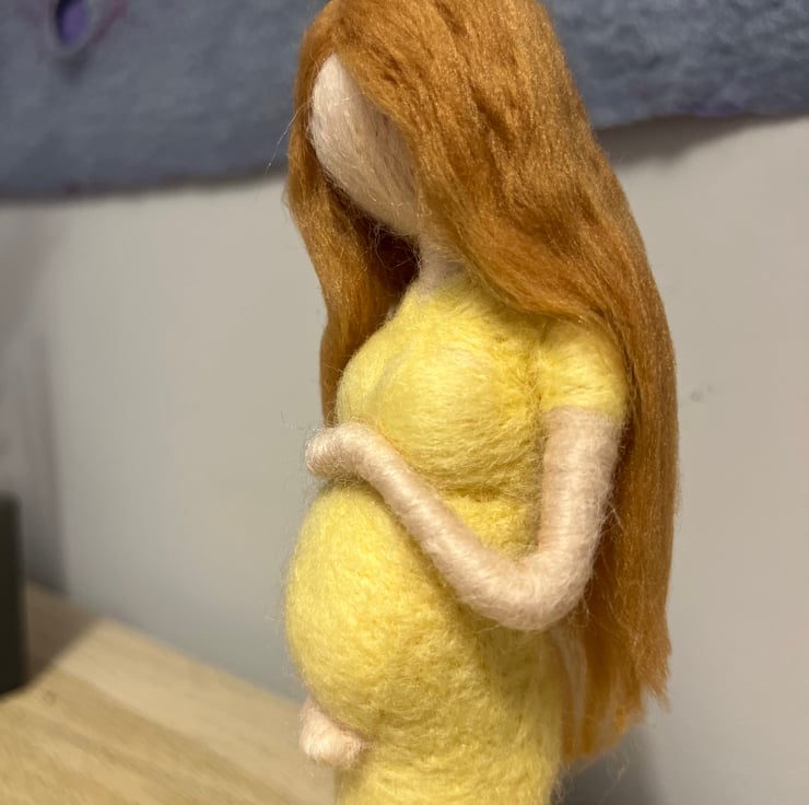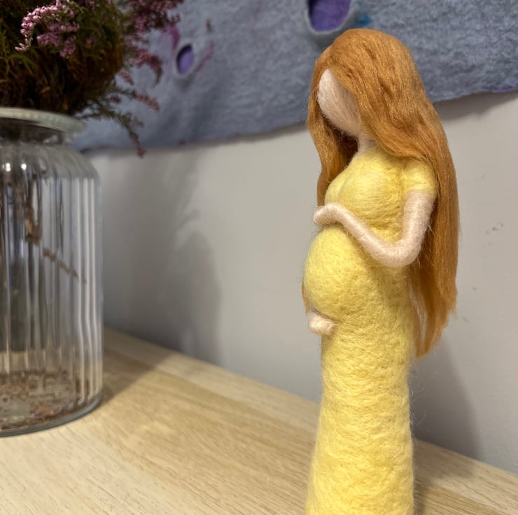Needle felted figure of a pregnant lady cradling her bump. Light skin tone and long dark blonde hair. Perfect baby shower gift. Wooden base can be fixed or left separate.