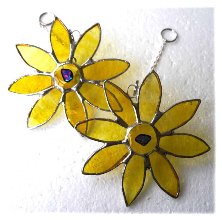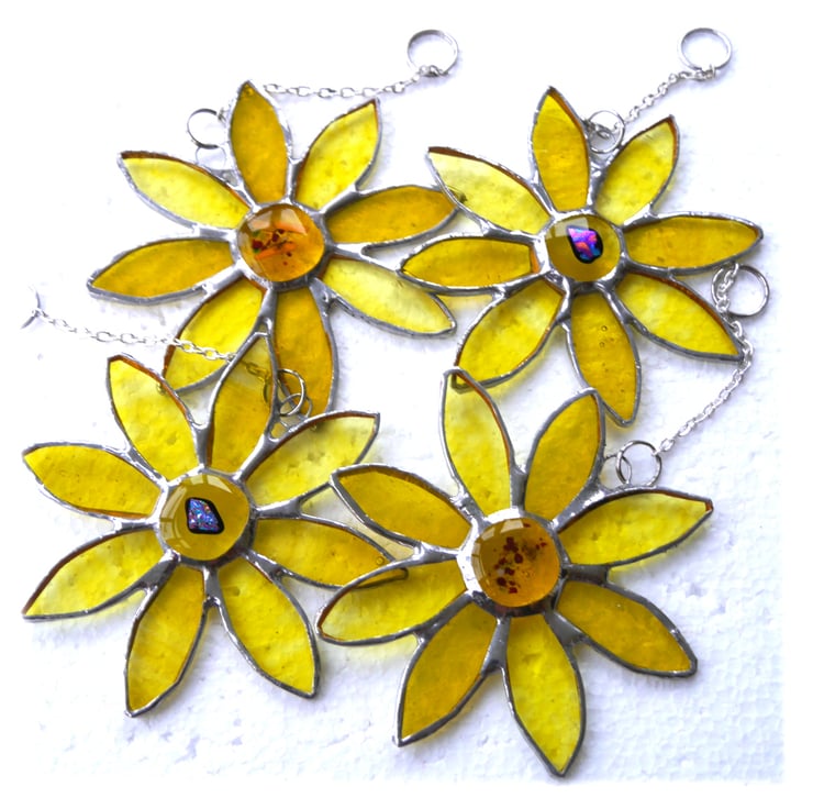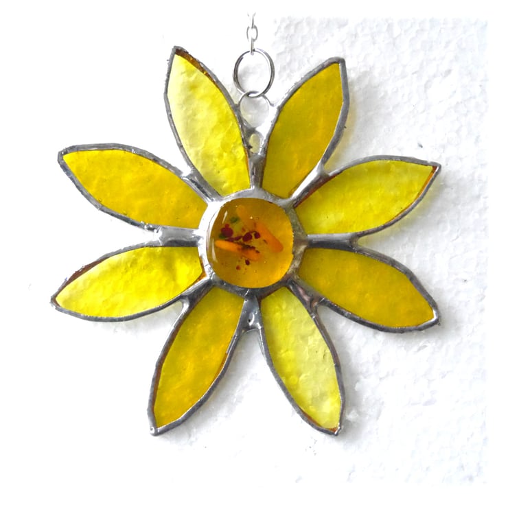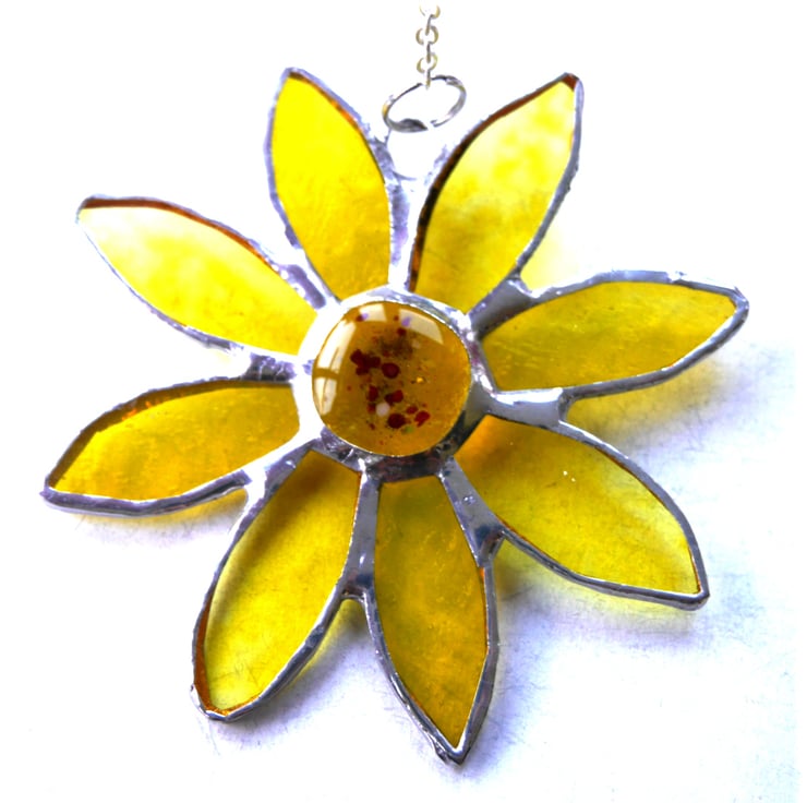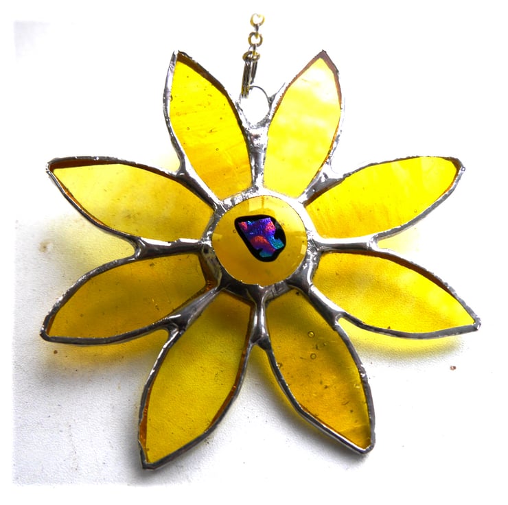 It is a gorgeous bright yellow sunflower with 8 petals made from 2 different shades and textures of lovely sunshine yellow glass.