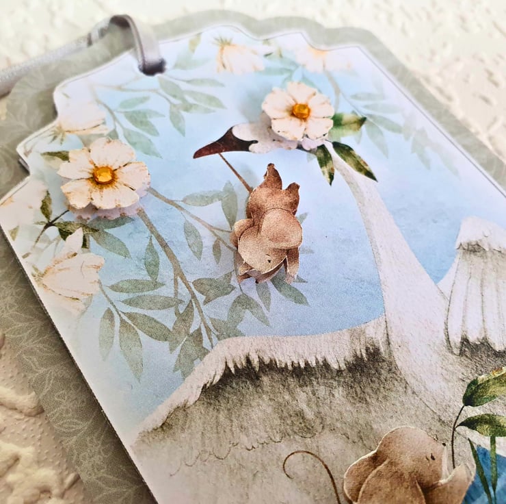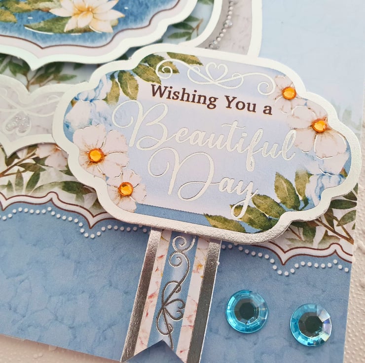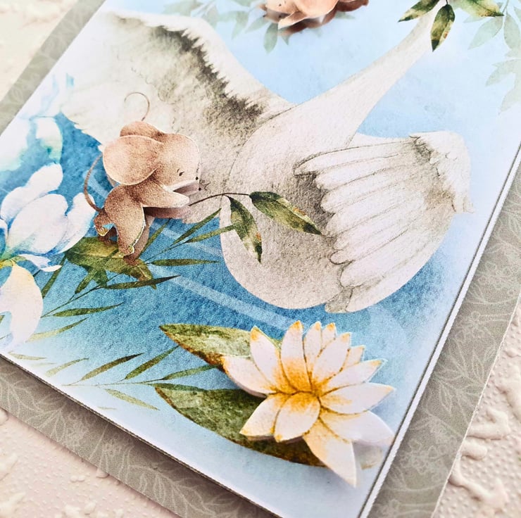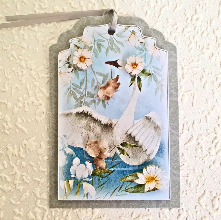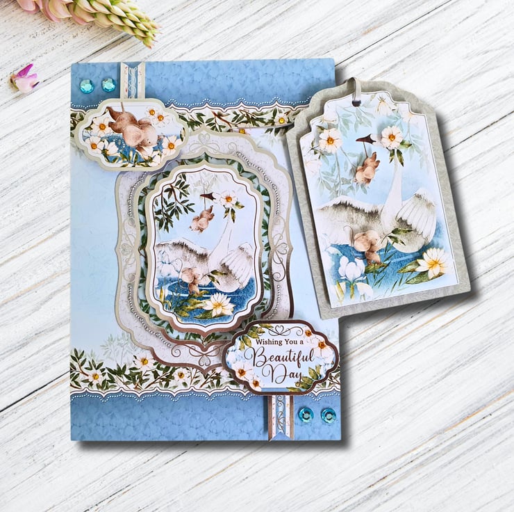 The card consists of mats & layers of floral patterned cardstock & vellum, on a white card base. It is decorated with coordinating silver foiled toppers & the sentiment "Wishing You A Beautiful Day". It is embellished with matching craft gems and glitter drops. The card features a beautiful swan, playing around with a baby elephant! It is finished with a matching insert that has been left blank, for you to add your messages and wishes. It measures approx.15x21cm (A5).