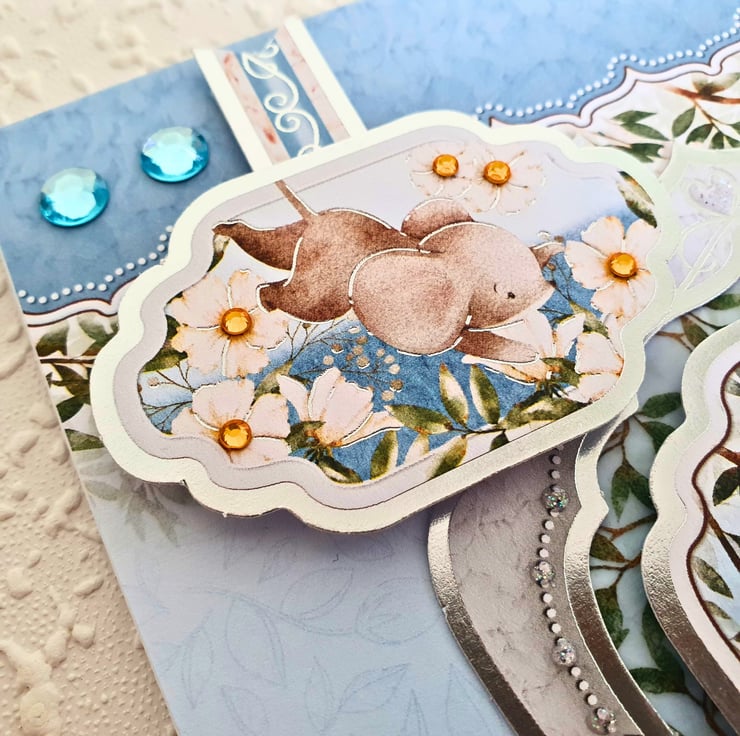 The gift tag features the same design as the card, decorated with raised, decoupaged elephants, flowers and craft gems. It measures 8.5 x 12.5 cm & is attached on ribbon.