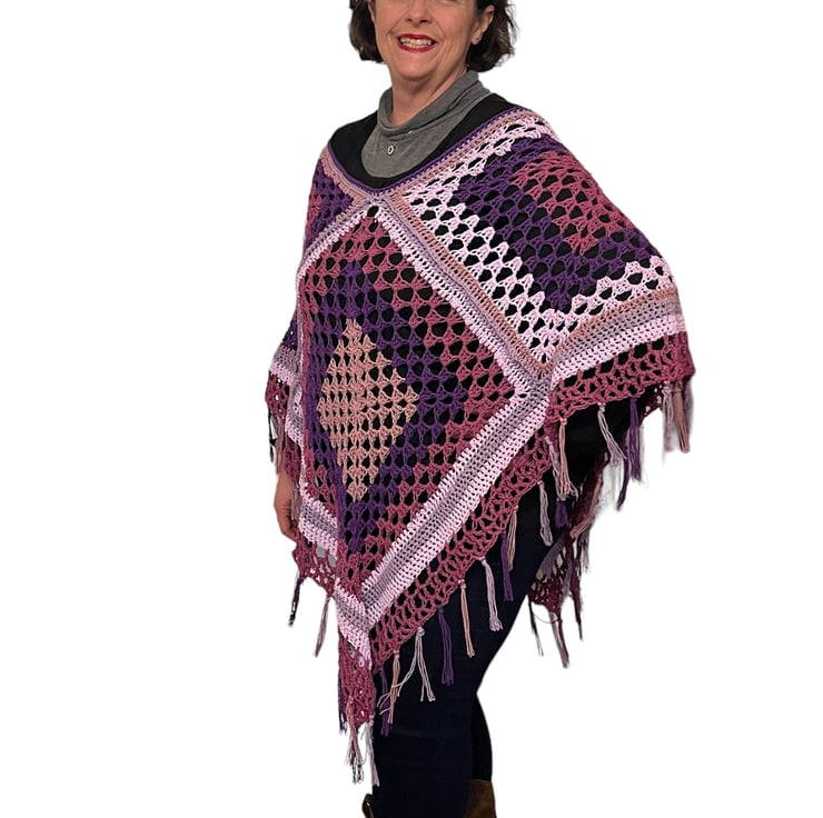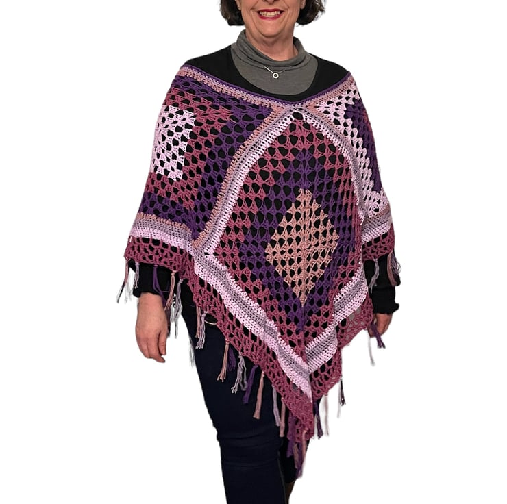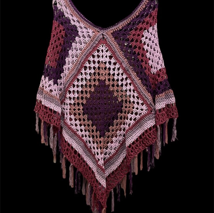 These ponchos are light and airy. Crocheted from a Bamboo/Acrylic blend yarn makes this the perfect poncho for Spring & Summer. One size fits most.
