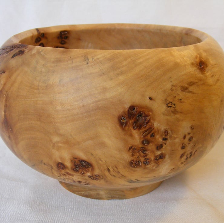 Poplar Burr bowl, 165 x 103mm (16.5 x 10.3 cm) decorative bowl. A nicely curving closed form bowl with foot that raises it up. Lovely warm golden colour with a high figured grain and knot patterns. Great for a decorative item or centre piece.