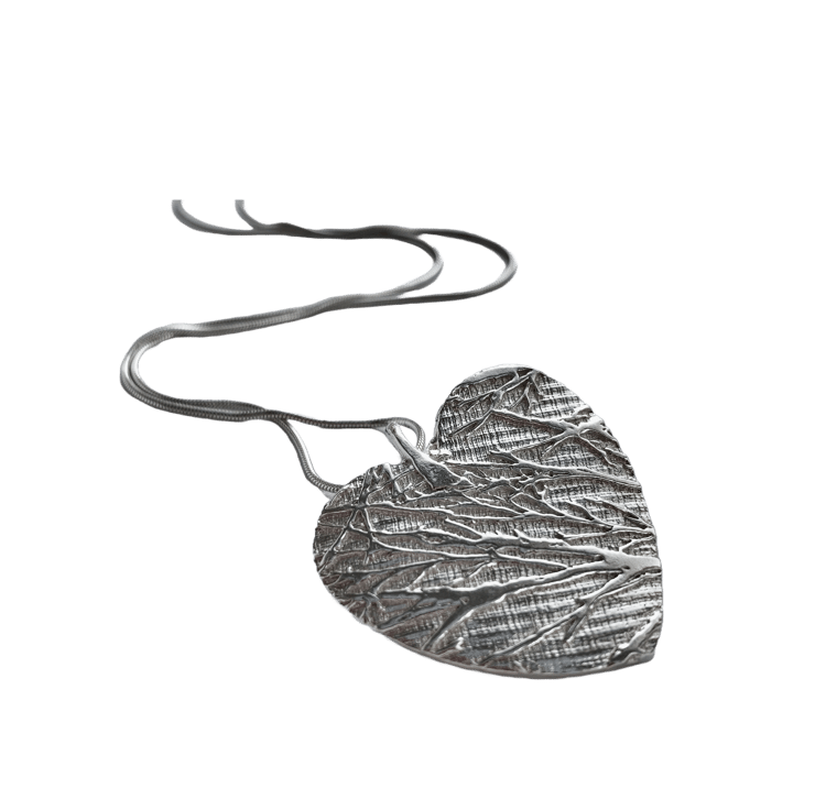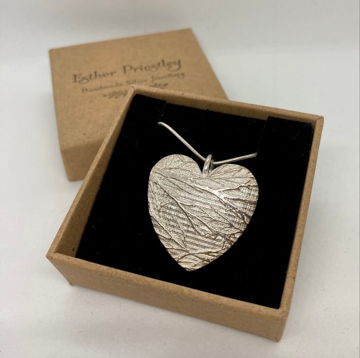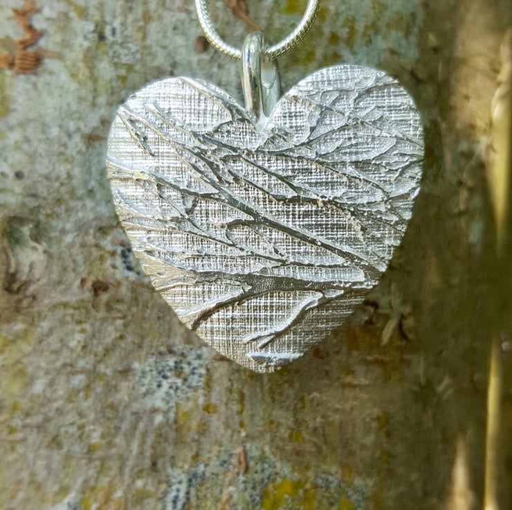 Handmade silver heart necklace -This beautiful silver heart pendant features a branch patterned texture and was inspired by the striking silhouette made by a silver birch tree against a winter sky on the local moor.