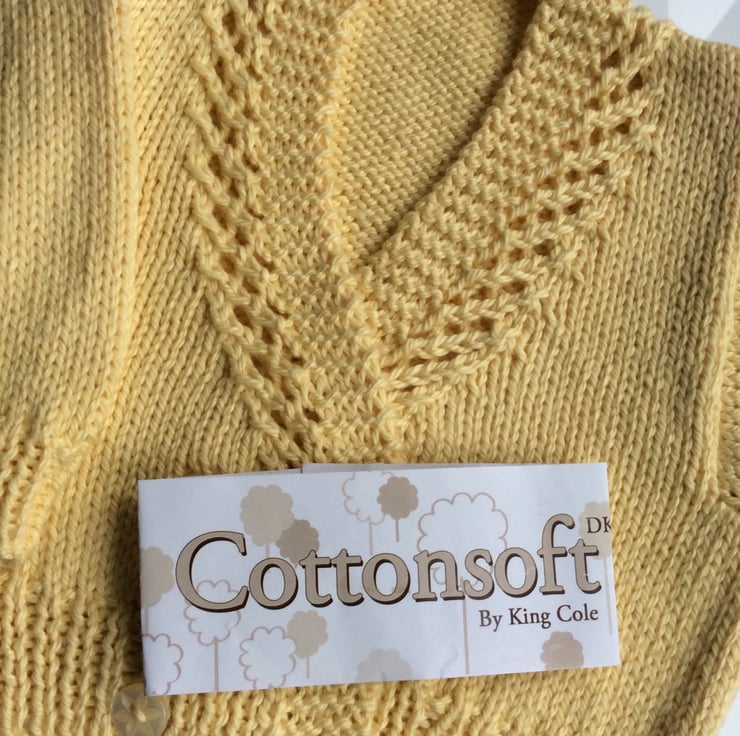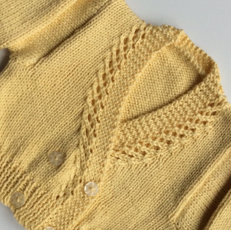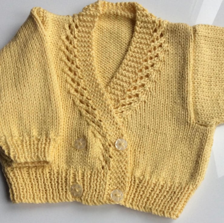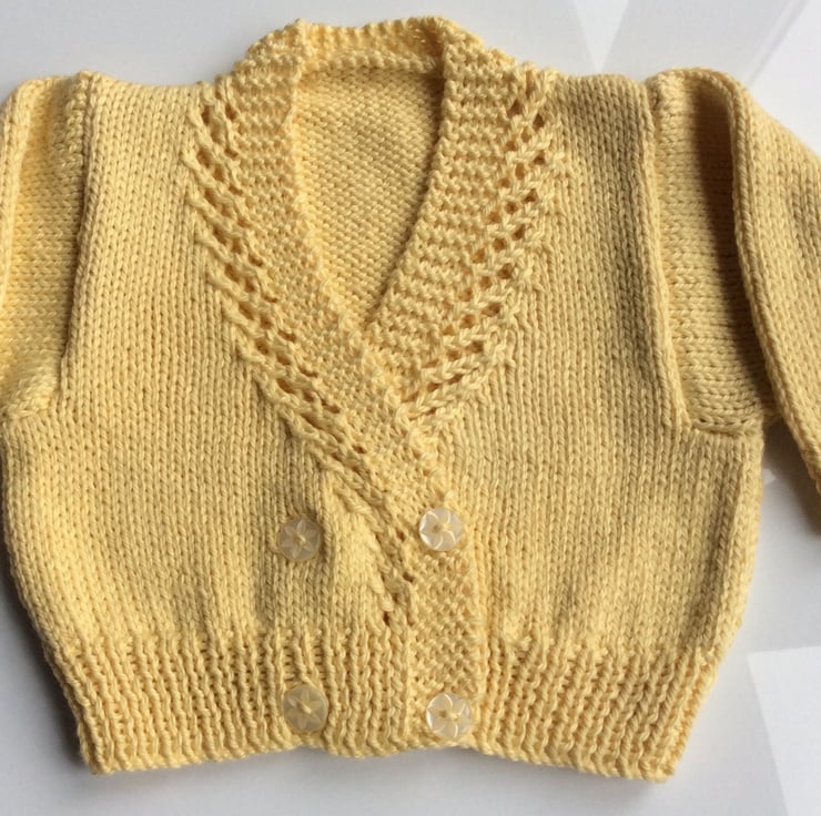 Beautifully soft 100% cotton baby cardigan hand knitted by me in my Suffolk home. I have used a good quality cotton baby yarn in buttermilk yellow shade to knit this sweet little crossover cardigan that fastens with 4 matching baby buttons. Will fit a little one of about 6-9 months.