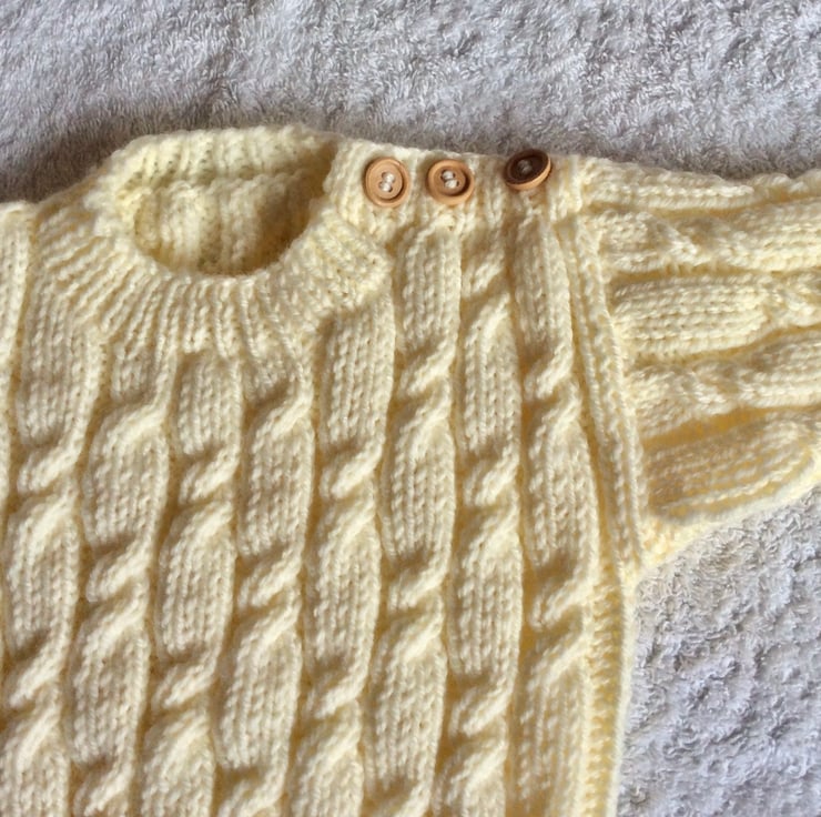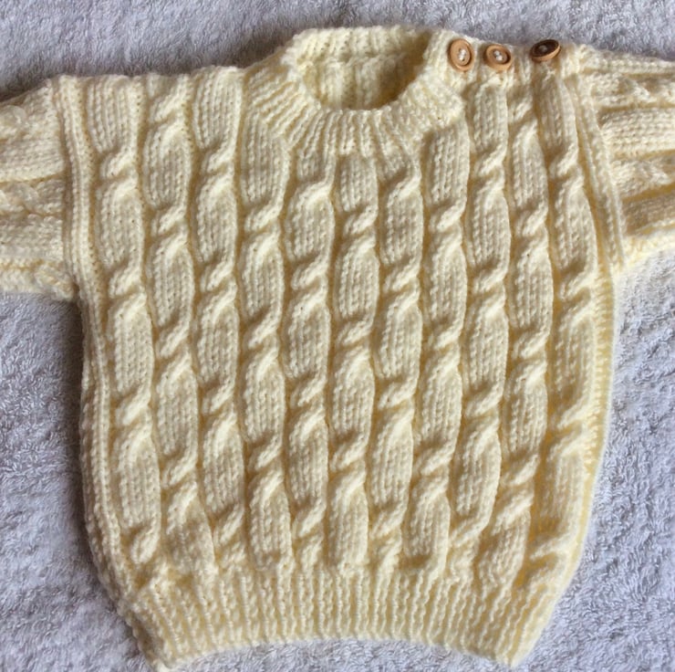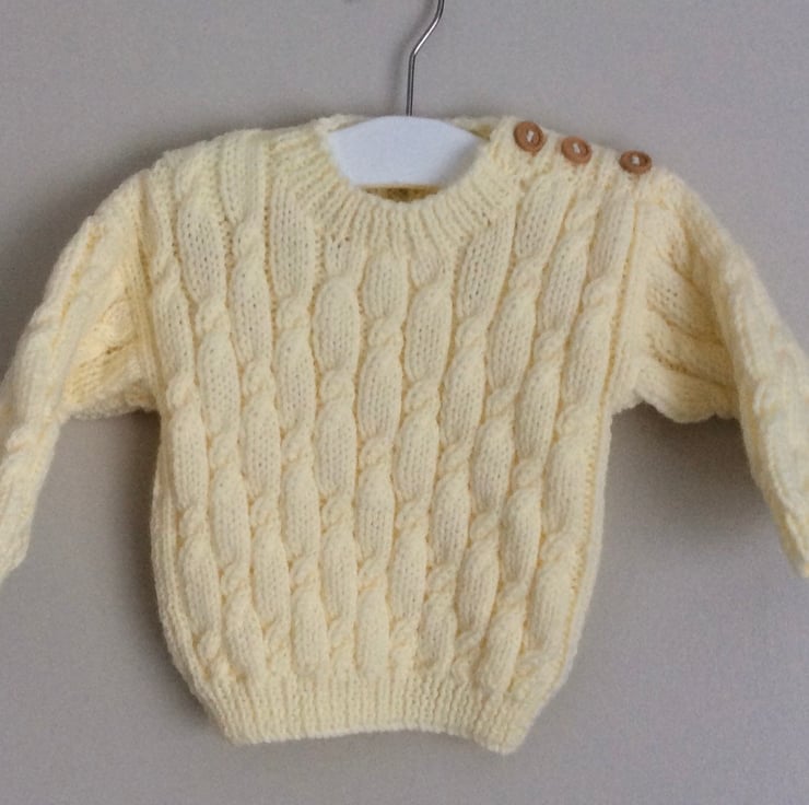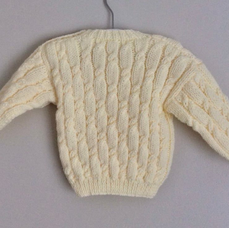 Very soft baby aran jumper hand knitted by me in my Suffolk home. I have used a top quality acrylic baby aran yarn in a lovely cream colour. Fastens at the neck with three little wooden buttons. To fit a baby of approximately 12 months. Garment measurements are