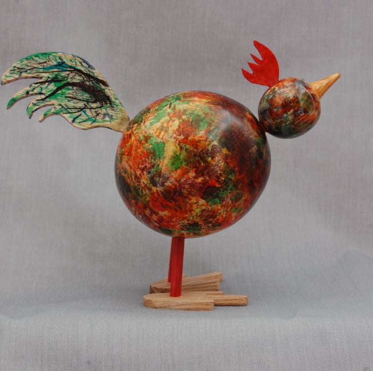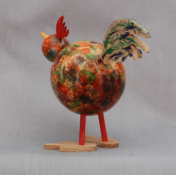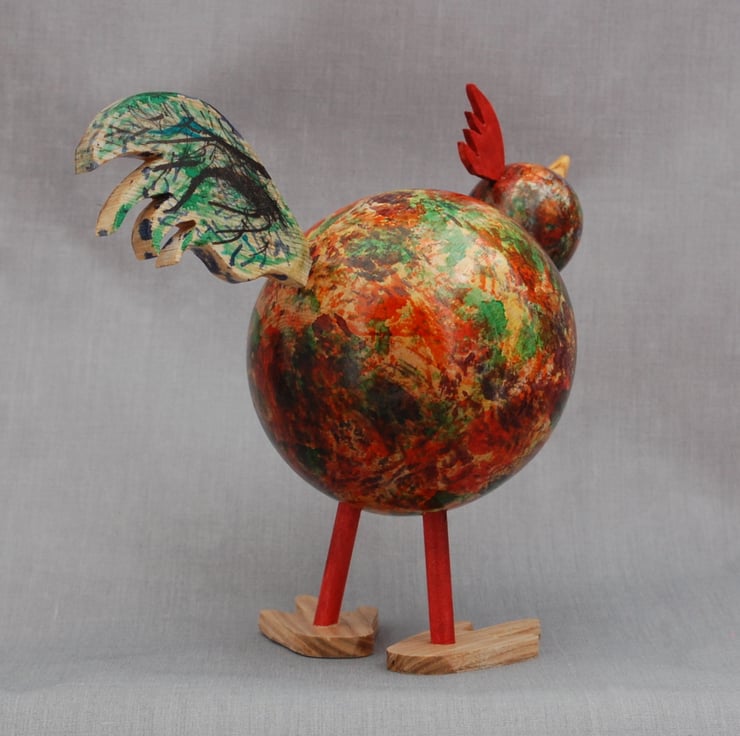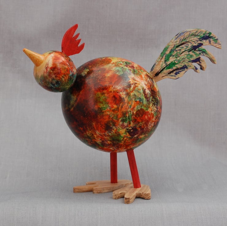 Zany, happy, amusing, meet our “Star Gazing ” carnival hen. As all hen watchers know, they cock their heads and inspect whatever is catching their eye. She measures approximately 15.5 cm from tail to beak, and 16 cm high. Made from ash and beech, she will brighten your day whenever you see or think of her. She measures approximately from tail to beak-15.5 cm, and 16 cm high.