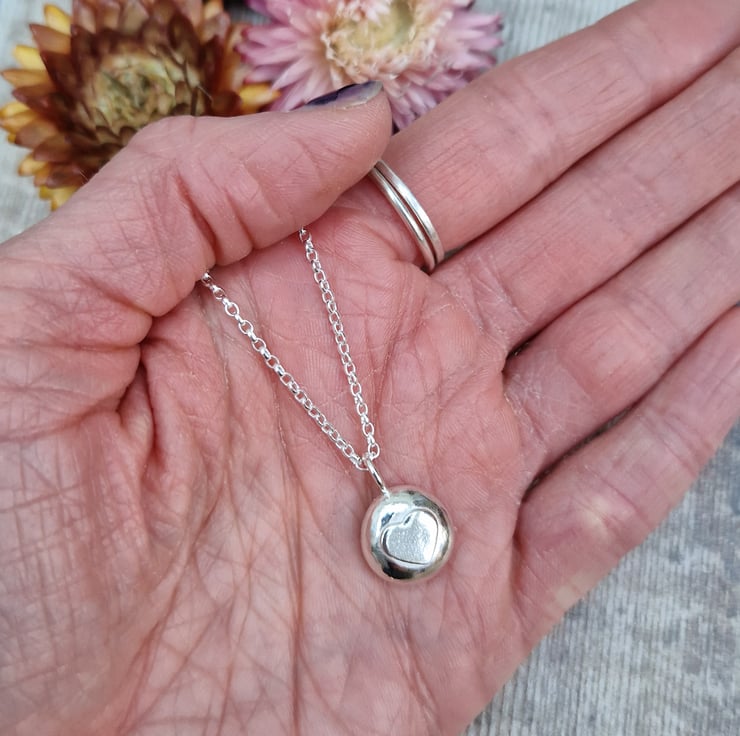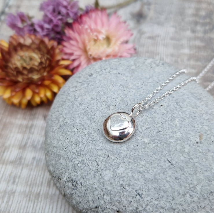 This handmade sterling silver necklace features a smooth pebble pendant with a softly raised heart at its center. The minimalist design highlights the elegance of silver, making it a perfect piece for everyday wear. Crafted in Bristol, UK, from recycled sterling silver, this necklace combines simplicity with a touch of sentimentality, making it an ideal choice for those who love meaningful, understated jewellery.