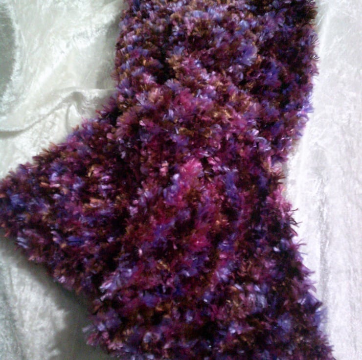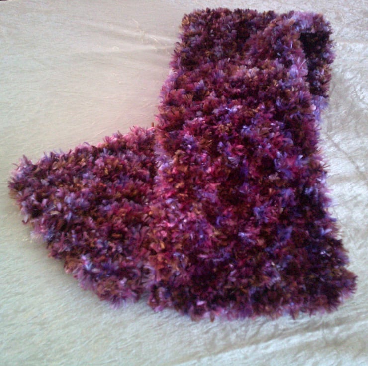 This hand knitted Necktie is made using an eyelash yarn called shimmer in shades of burgundy and pink.