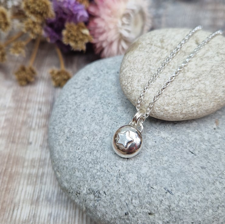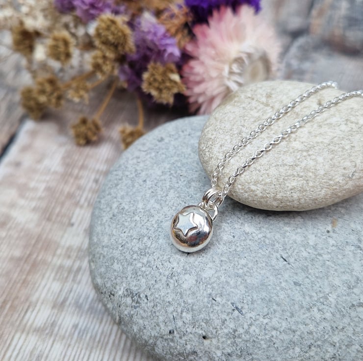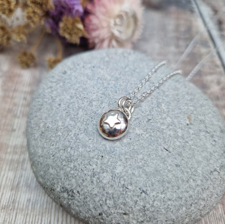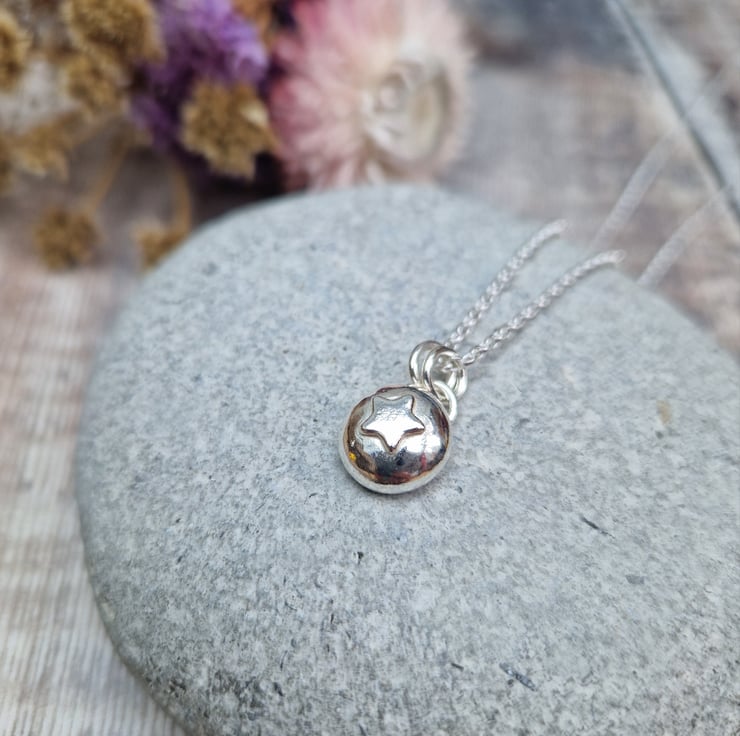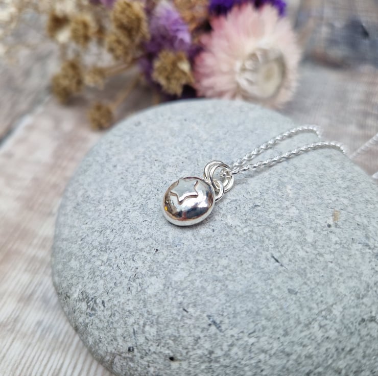 This handmade silver pebble necklace is crafted from recycled sterling silver, featuring a softly rounded pendant with a subtle star detail. The organic shape and polished finish give it a beautifully simple charm, making it a versatile piece for everyday wear or a thoughtful gift.
