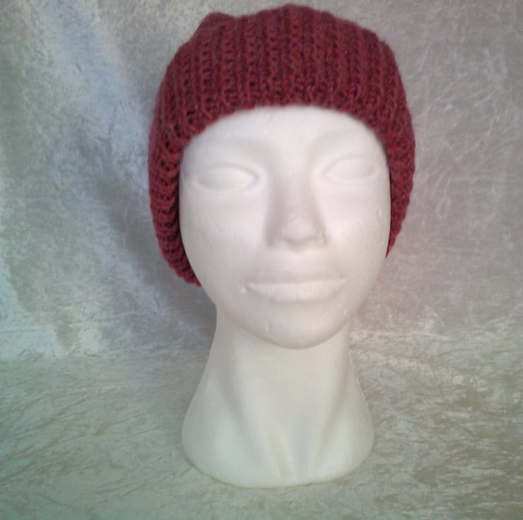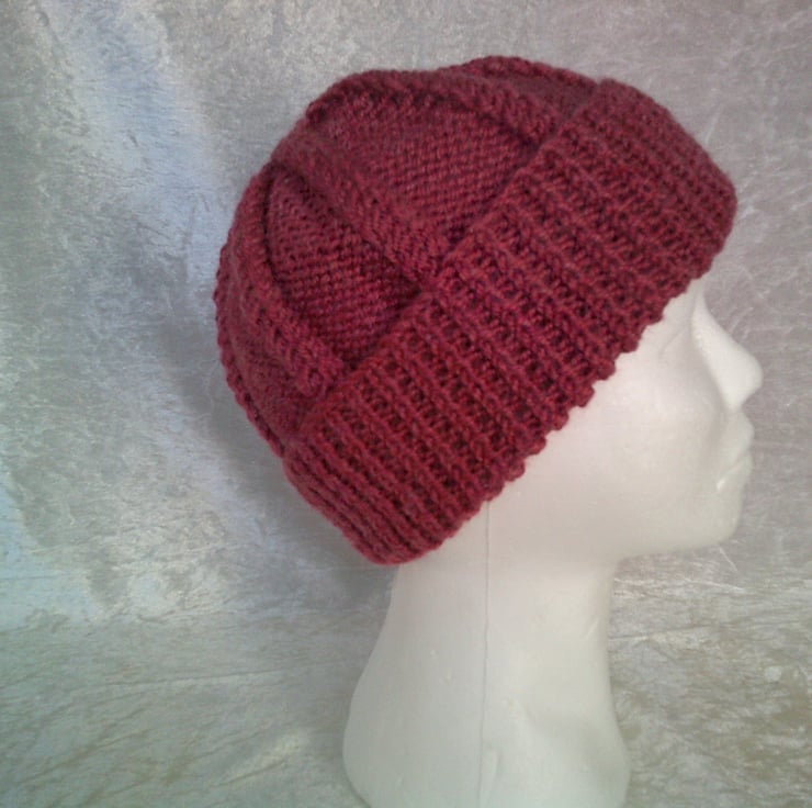 Hand knitted adult hat in Dark Red with a cable design this hat is machine washable on a 40 degree wash.